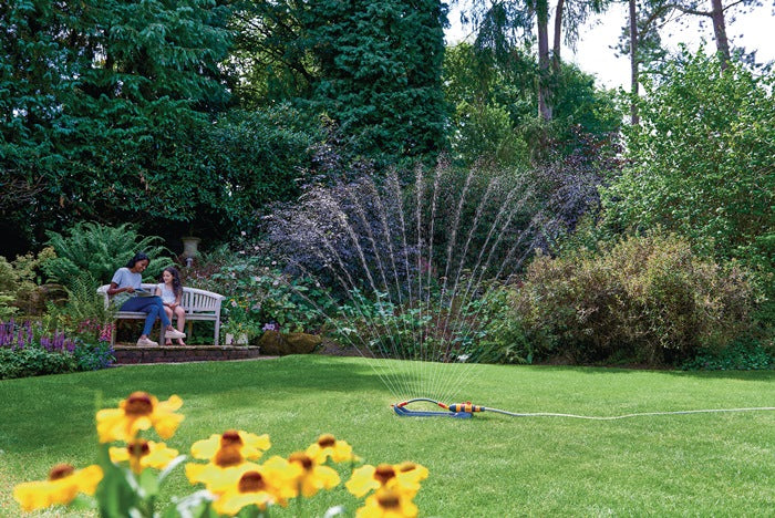 Viereckregner · ausgestattet mit einer 3D-Steuerung, mit der sich dieser Regner exakt an die Form und Größe jedes Gartens anpassen lässt · Sprührichtung leicht einstellbar · 14 - 20 einsetzbare Düsen für gezielte und wassersparende Bewässerung