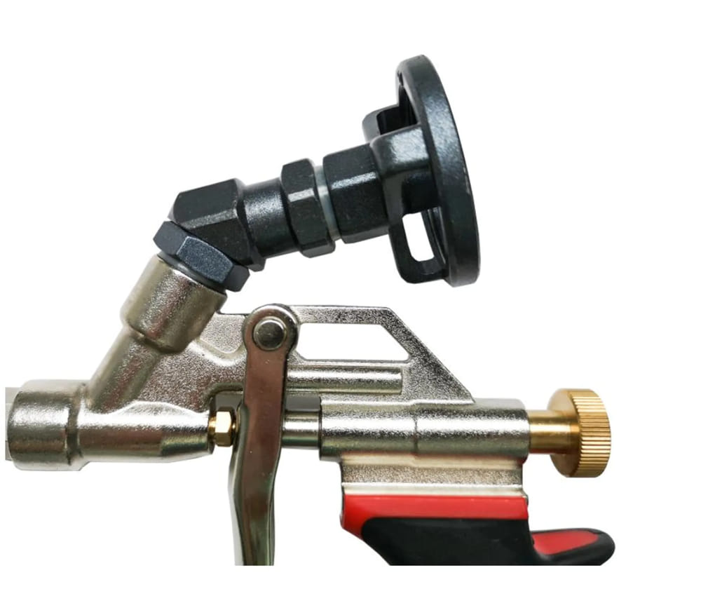 robuste Metallpistole · gummierter Griff · griffige Messingstellschraube · mit abgewinkeltem PTFE-Adapter für eine optimale Dosenentleerung · Schäumen im Stehen durch 80 cm Pistolenrohr · gummierter Griff für optimalen Halt · inkl. 2 Aufsätzen (für z. B. Perimeter-Klebeschaum)