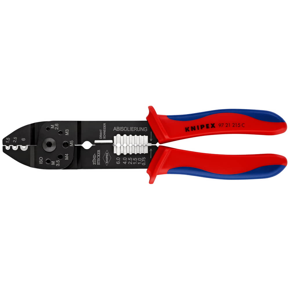 zum Kabelschneiden, Abisolieren von Drähten und Quetschen von isolierten und unisolierten Kabelschuhen und Steckverbindern und offenen Stechverbindern · mit Gewindelöchern zum Abschneiden von Cu- und Ms-Gewindestiften M 2,6 / 3 / 3,5 / 4 / 5 · aus hochfestem Spezialstahl Zange schwarz lackiert · mit Mehrkomponenten-Hüllen