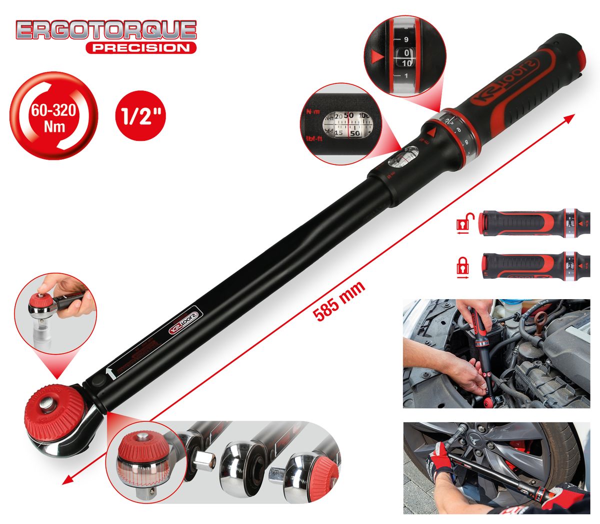1/2" ERGOTORQUE®precision Ratschen-Drehmomentschlüssel Drehknopf, 60-320Nm · ERGOTORQUE®precision Drehmomentschlüssel mit Drehknopf-Umsteck-Ratschenkopf
