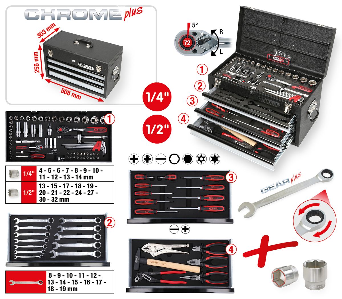 KS TOOLS 1/4"+1/2" CHROMEplus Universal-Werkzeug-Satz, 99-tlg GEAR ( 918.0100 )