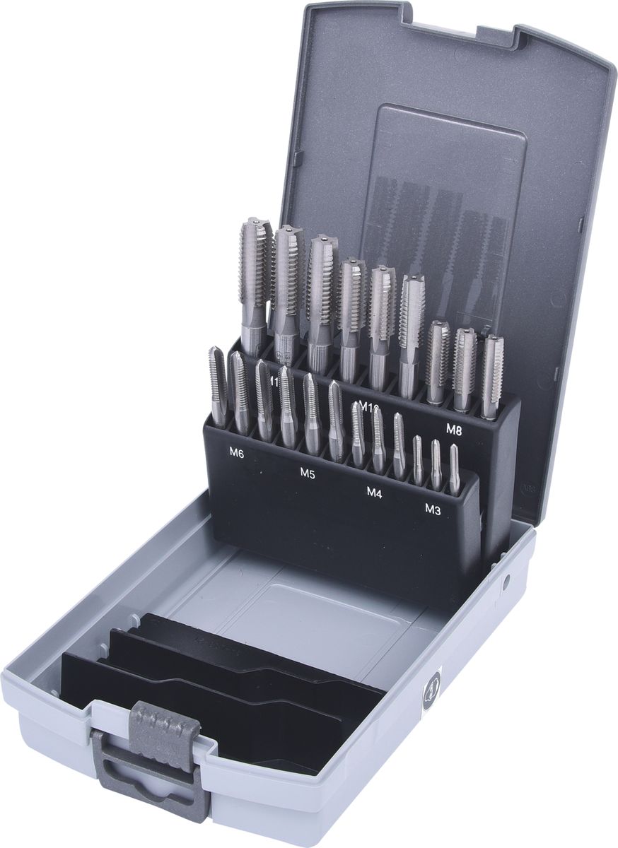 HSS CO Handgewindebohrer-Satz M, Kunststoffkassette 21-tlgM3-M12 · HSS Co Handgewindebohrer-Satz M in Kunststoffkassette
