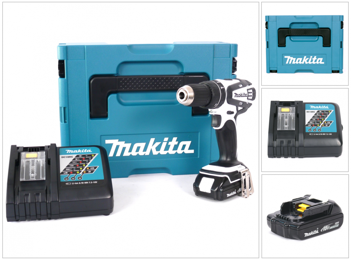 Makita DHP 456 Y1J-D 18 V Akku Schlagbohrschrauber in Weiss im MAKPAC inkl. BL 1815 N Akku + DC18RC Ladegerät