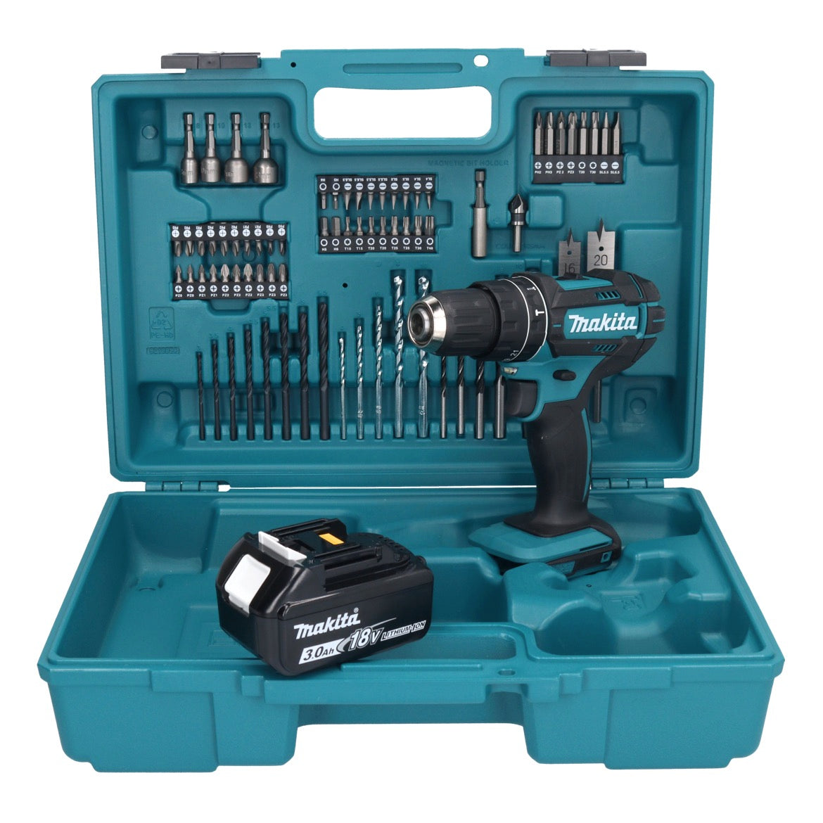 Makita DHP 482 F1X1 Akku Schlagbohrschrauber 18 V + 1x Akku 3,0 Ah + 74 tlg. Zubehörset + Koffer - ohne Ladegerät