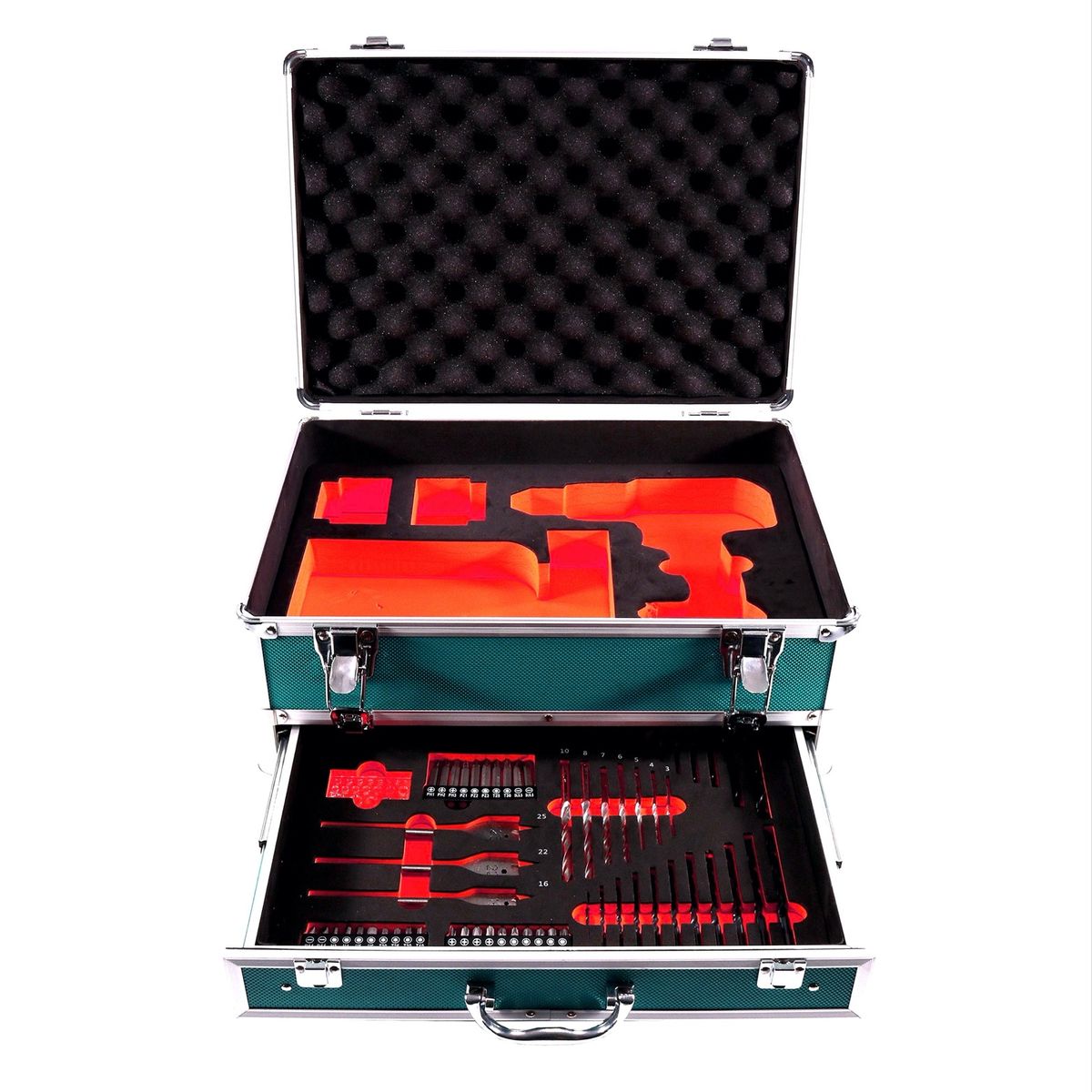 Der Toolbrothers TX Aluminium Werkzeugkoffer bietet ausreichend Platz für eine Maschine ( z.B. einen Schlagbohrschrauber ), ein Ladegerät und bis zu zwei Akkus. Durch das in der Schublade vorhandene 70 teilige Bit und Bohrer Set sind sämtliche Anwendungen abgedeckt. Es sind Bits, Fräser, Steckschlüssel und Bohrer in vielen Varianten vorhanden. Ob Holz, Metall oder Stein der Koffer beinhaltet eine Vielzahl an Bohrern in den gängigsten Größen. Die gute Verarbeitung des Koffers verspricht eine lange Lebensdauer und ist zudem auch echt schön anzusehen. Der gummierte Tragegriff ist schonend für die Handinnenflächen und kann auch problemlos mit Handschuhen genutzt werden. Die Metallschließen des Koffers sind robust und langlebig. Die Einlagen im Boden und im Deckel gewährleisten einen sicheren Transport der im Koffer befindenden Maschinen. Durch den Aluminium Koffer TX hat man das Arbeitswerkzeug und das entsprechende Zubehör in einem Koffer und sicher gelagert.