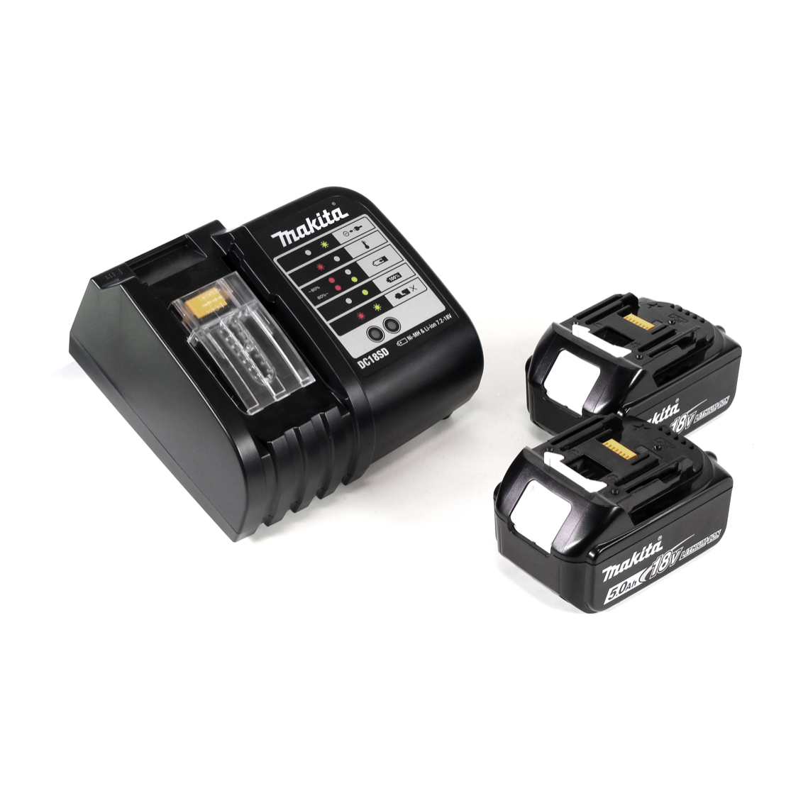 Der Makita BL 1850 B Akku überzeugt durch seine lange Arbeitszeit. Ein zusätzlicher Vorteil ist die kurze Ladezeit von nur 45 Minuten im Makita Ladegerät. Der Akku verfügt dank geringer Selbstentladung und Kurzschluß-, Überspannungs- und Überhitzungsschutz über maximale Lebensdauer. Zudem besitzt der BL 1850 B noch eine LED - Ladestandsanzeige zum Überprüfen der Restenergie im Akku. Das Makita DC 18 SD ist ein Ladegerät für Li-ion und Ni-MH Akkus von 7,2 - 18V. Das Ladegerät verfügt über eine LED-Anzeige, die über den aktuellen Status des Ladevorganges informiert.