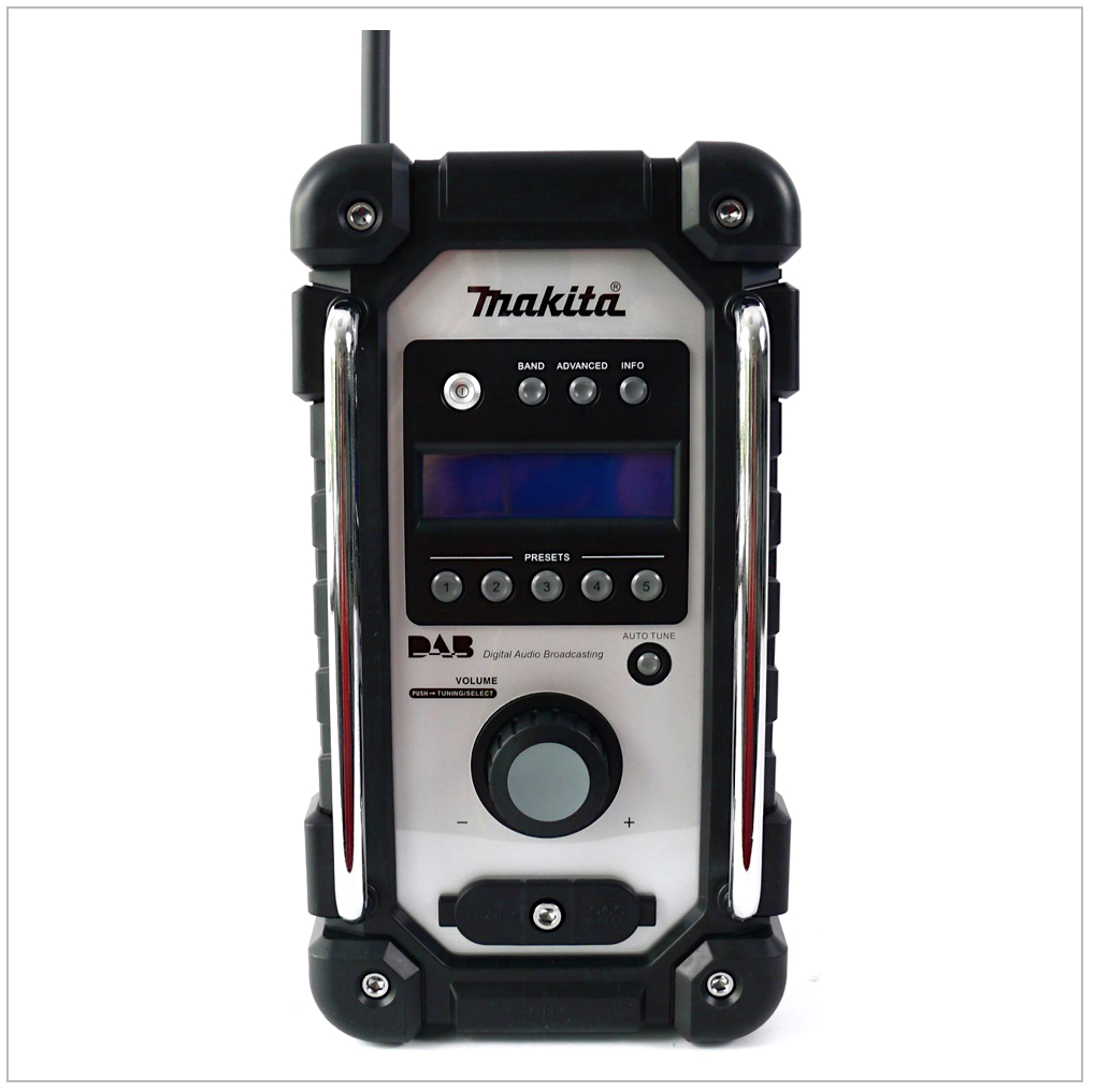 Das DMR 104 W Baustellen Radio in Weiß von Makita überzeugt durch seine hohe Klangqualität der 3-Zoll Stereo-Lautsprecher und Robustheit des Gehäuses. Das mit einem Tragegriff ausgestattete Gehäuse ist an den äußeren Rändern gummiert und jegliche Öffnungen Staub- und Schmutzfest verschlossen. Zudem ist ein Schutz gegen allseitiges Spritzwasser gemäß IPX 4 garantiert. Das Baustellenradio empfängt Kanäle im FM / DAB Bereich über eine mitgelieferte flexible Stabantenne. Ein Großes LCD-Display mit Beleuchtung ermöglicht eine einfache manuelle oder vollautomatische Sendereinstellung. Der Sendersuchlauf und die Lautstärkeregelung werden vereinfacht über einen Drehknopf gesteuert und reduzieren den Umgang mit dem Radio aufs einfachste. Auf jedem Band können bis zu 5 Sender voreingespeichert werden. Sollte der Musikwunsch nicht im Radio zu finden sein, besitzt das DMR 104 auch AUX- und Micro-USB - Anschlüsse, um den eigenen iPod, MP3 oder CD-Player anzuschließen. Das Radio kann über gängige 7,2 - 18 Volt Makita Einschub- und Aufsteckakkus oder über den mitgelieferten Netzadapter betrieben werden.
