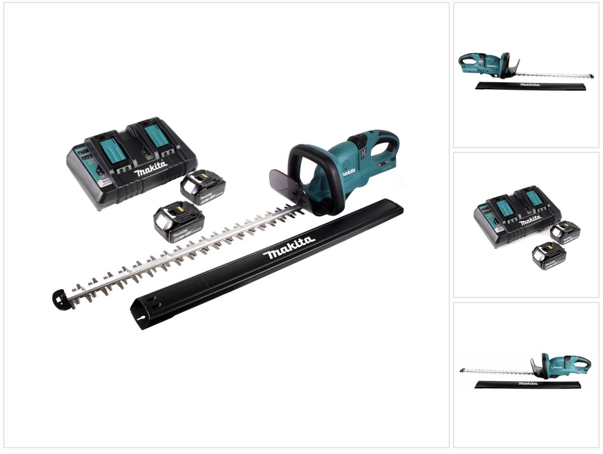 Die Akku-Heckenschere DUH 651 aus dem Hause Makita überzeugt mit ihrem leistungsstarken 36V - Motor (2x18V) und einem ergonomischen und drehbaren Griff. Dieser ermöglicht eine Arretierung bei 0°, 45° und 90°, wodurch stets eine optimale Haltung beim Arbeiten möglich wird. Die Heckenschere arbeitet sehr leise, wodurch in besonders lärmempfindlichen Bereichen gearbeitet werden kann. Die optimal ausgewogene Gewichtsverteilung reduziert Ermüdungserscheinungen in Unterarm und Händen. Des Weiteren ist die DUH 651 mit einem Sanftanlauf, einer Motorbremse und einem rostfreien Messer ausgestattet. Die Hubzahl lässt sich elektronisch regeln. Inklusive zu dem DUH 651 kommen zwei Makita BL 1860 B 18 V - 6,0 Ah / 6000 mAh Li-Ion Akkus mit LED - Anzeige und ein Makita DC 18 RD Ladegerät 7.2V - 18V für 2 Li-Ion Akkus - 2-fach Ladegerät hinzu. Der Makita BL 1860 B ist ein 18 Volt starker Li-Ion 6 Ah / 6000 mAh Akku mit LED-Ladestandsanzeige. Der Akku überzeugt durch seine erhöhte Ausdauer und Leistungsabgabe, bei einem lediglich nur 40 Gramm höheren Gewicht gegenüber dem 5 Ah Akku von Makita. Die vollständige Ladezeit beträgt zudem nur 55 Minuten (mit einem DC 18 RC Ladegerät), was den Akku im Vergleich zur Arbeits- bzw. Standzeit extrem schnell wieder einsatzfähig macht. Wie gewohnt ist der 1860 B mit allen Geräten der 18 Volt Klasse von Makita kompatibel und besitzt eine lange Laufzeit und Lebensdauer danke der Li-Ion Technologie. Das DC 18 RD ist ein 2-fach Ladegerät von Makita womit 2 Akku´s gleichzeitig geladen werden können. Das Schnellladegerät kann wie gewohnt alle Akku´s von 7,2 V bis 18 V laden. Der praktische USB Anschluss an der Vorderseite eignet sich perfekt für Smartphones, Lampen und vieles mehr was mit USB Ladefähig ist.