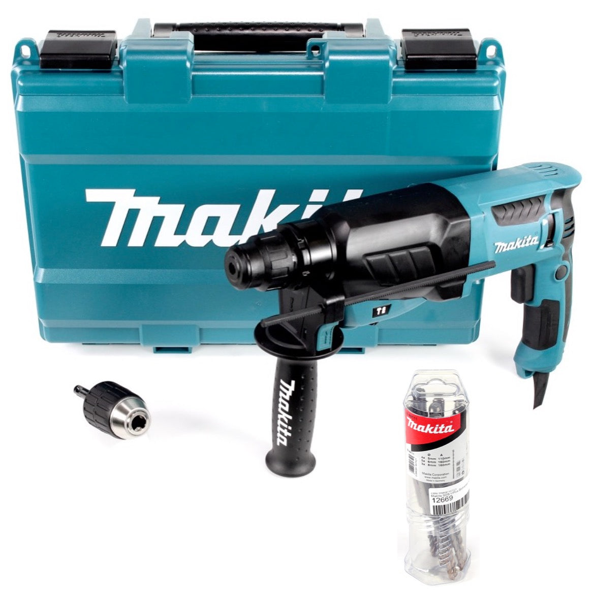 Makita HR 2630 X7 - 800 Watt 2,4 Joule Bohrhammer mit SDS - Plus Aufnahme im Koffer + Makita SDS-VPlus Bohrerset 12 tlg.