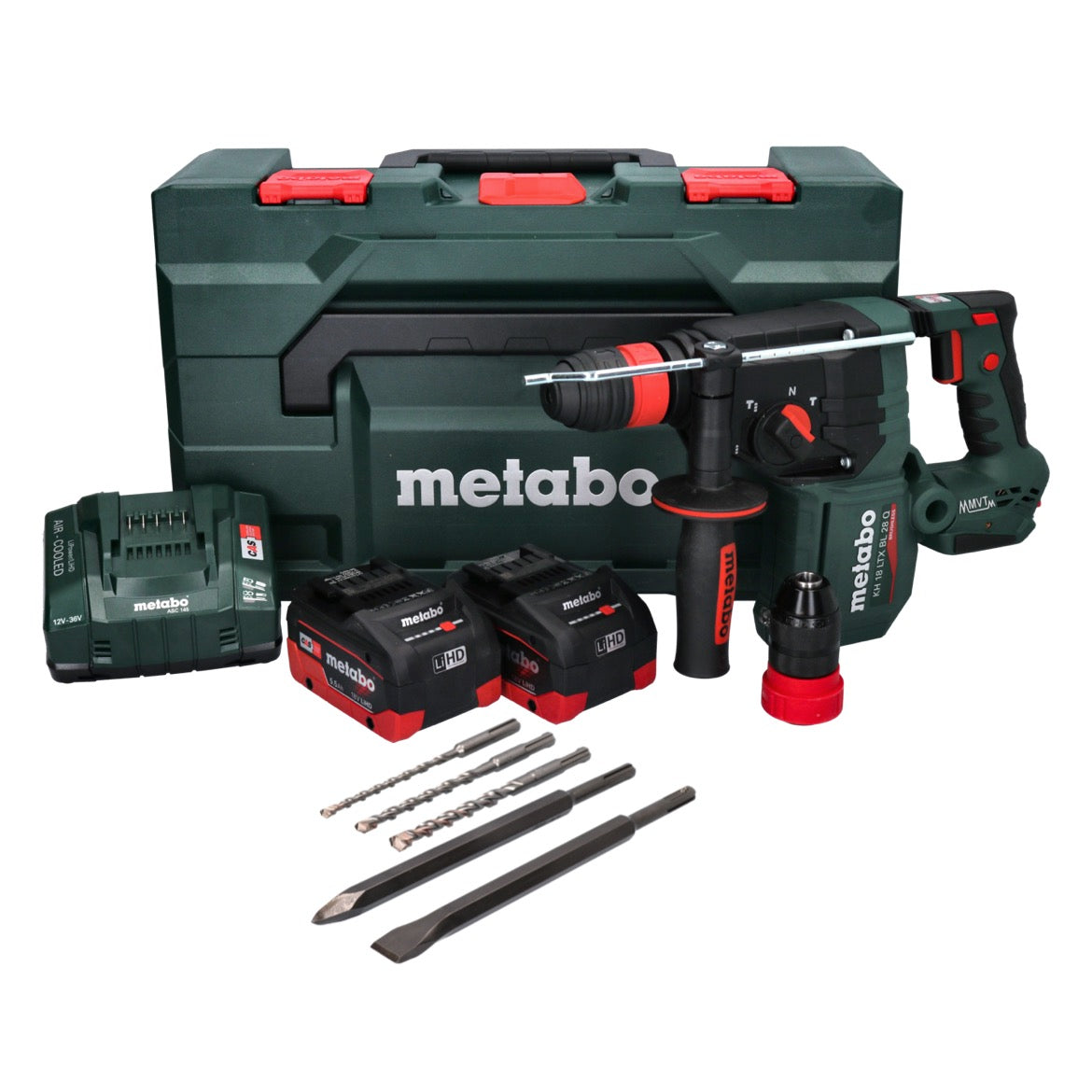 Metabo KH 18 LTX BL 28 Q Akku Bohrhammer 18 V 3 J SDS plus Brushless + 2x Akku 5,5 Ah + Ladegerät + 5 tlg. Bohrer Meißel Set + metaBOX