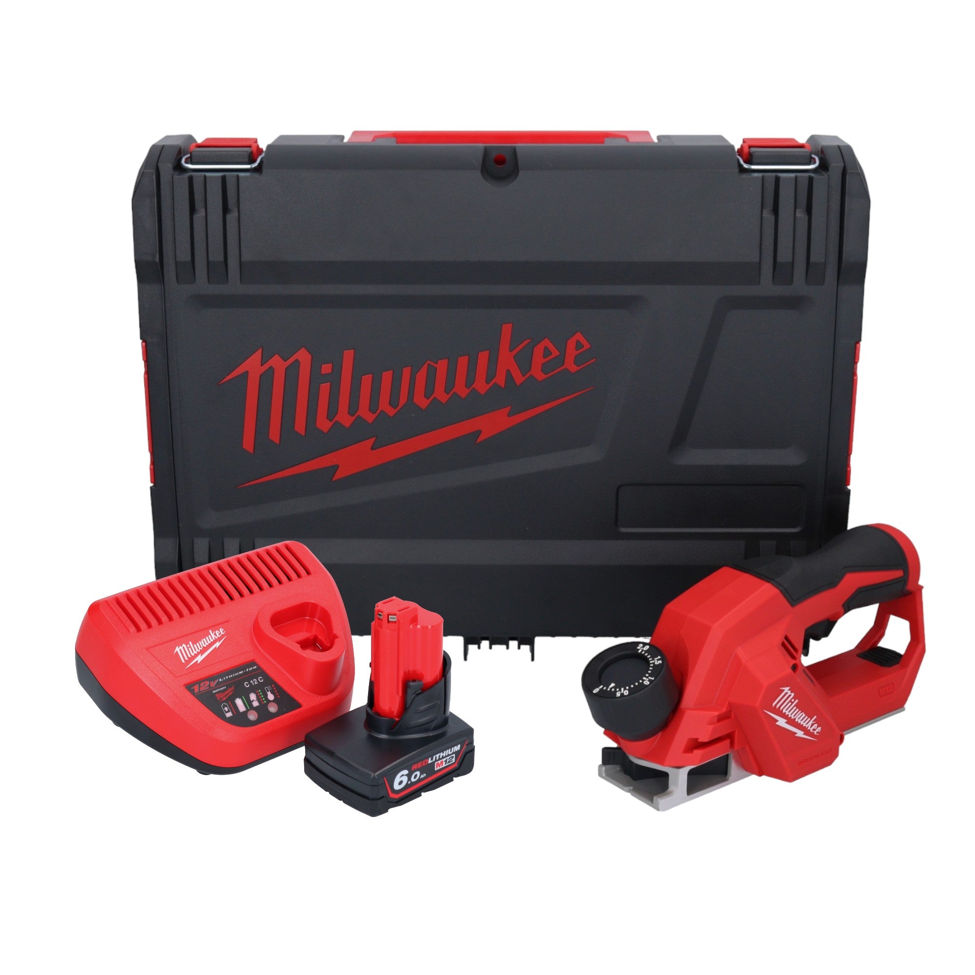Milwaukee M12 BLP-601X Akku Hobel 12 V 51 mm Brushless + 1x Akku 6,0 Ah + Ladegerät + HD Box