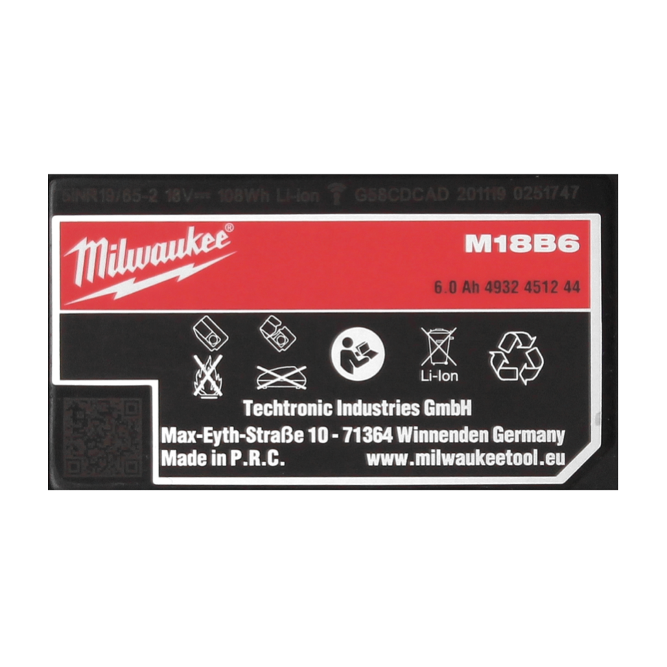 - 2x Milwaukee M18 B6 Akku 18 V 6,0 Ah / 6000 mAh ( 4932451244 )