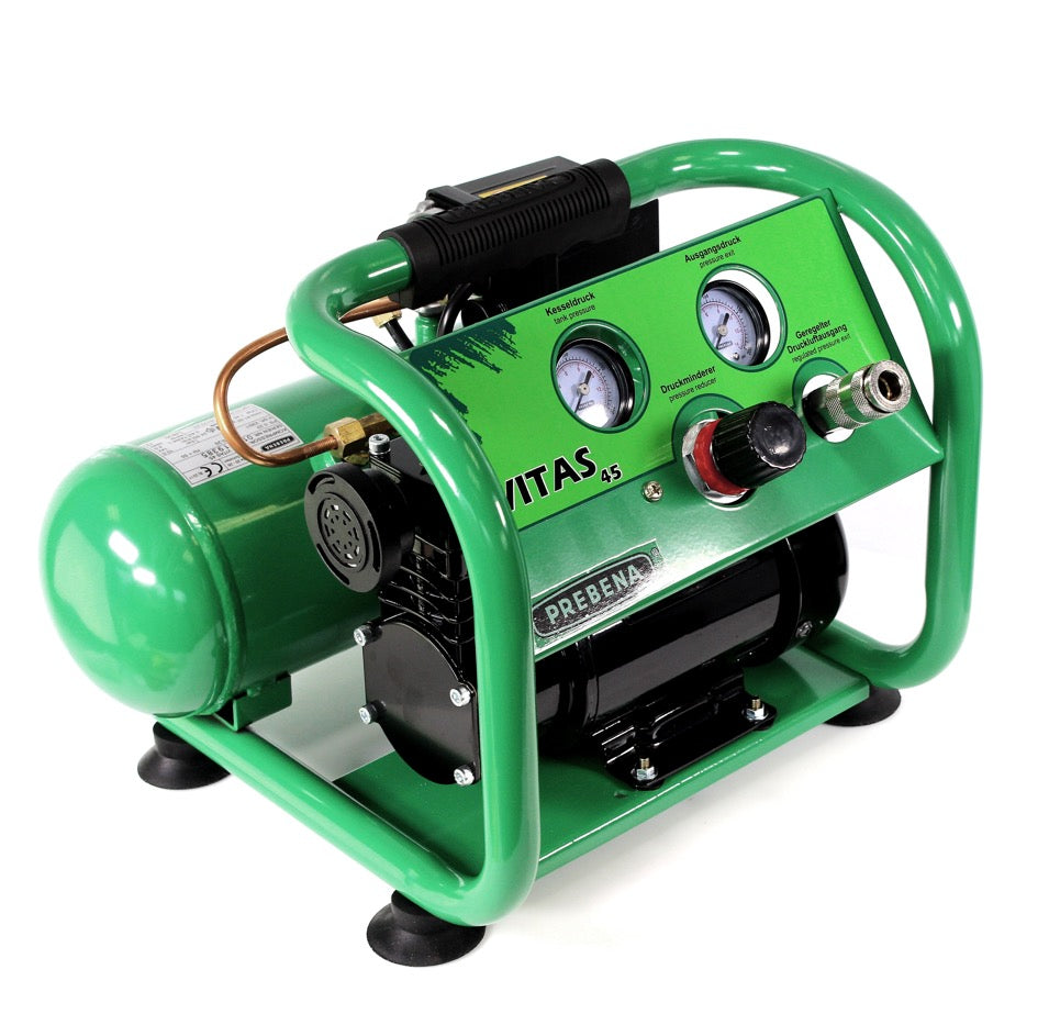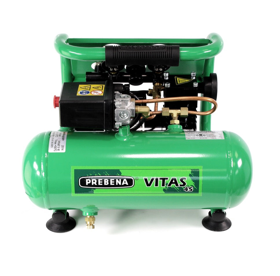 Der Kolbenkompressor Vitas 45 von Prebena ist ein leistungsfähiger und kompakter Kompressor. Das Gerät überzeugt durch seinen leistungsstarken 230 V Motor, 24 l/min Füllleistung und mit einer Ansaugleistung von 41/min. Weiterhin verfügt der Kolbenkompressor über geschützte Amaturen und eine anwenderfreundliche Handhabung. Durch sein geringes Gewicht ist jederzeit ein einfacher Transport möglich. Der Kompressor verfrügt über ein Kesseldruckmanometer, ein Ausgangsdruckmanometer, sowie über einen Druckminderer am Druckluftausgang. Der Handgriff ist gummiert und verfügt einen Antirutschbelag. Die massiven Gummifüße des Geräts sorgen für einen sicheren Stand. Da das Gerät ölfrei betrieben wird, ist niemals ein Ölwechsel nötig.