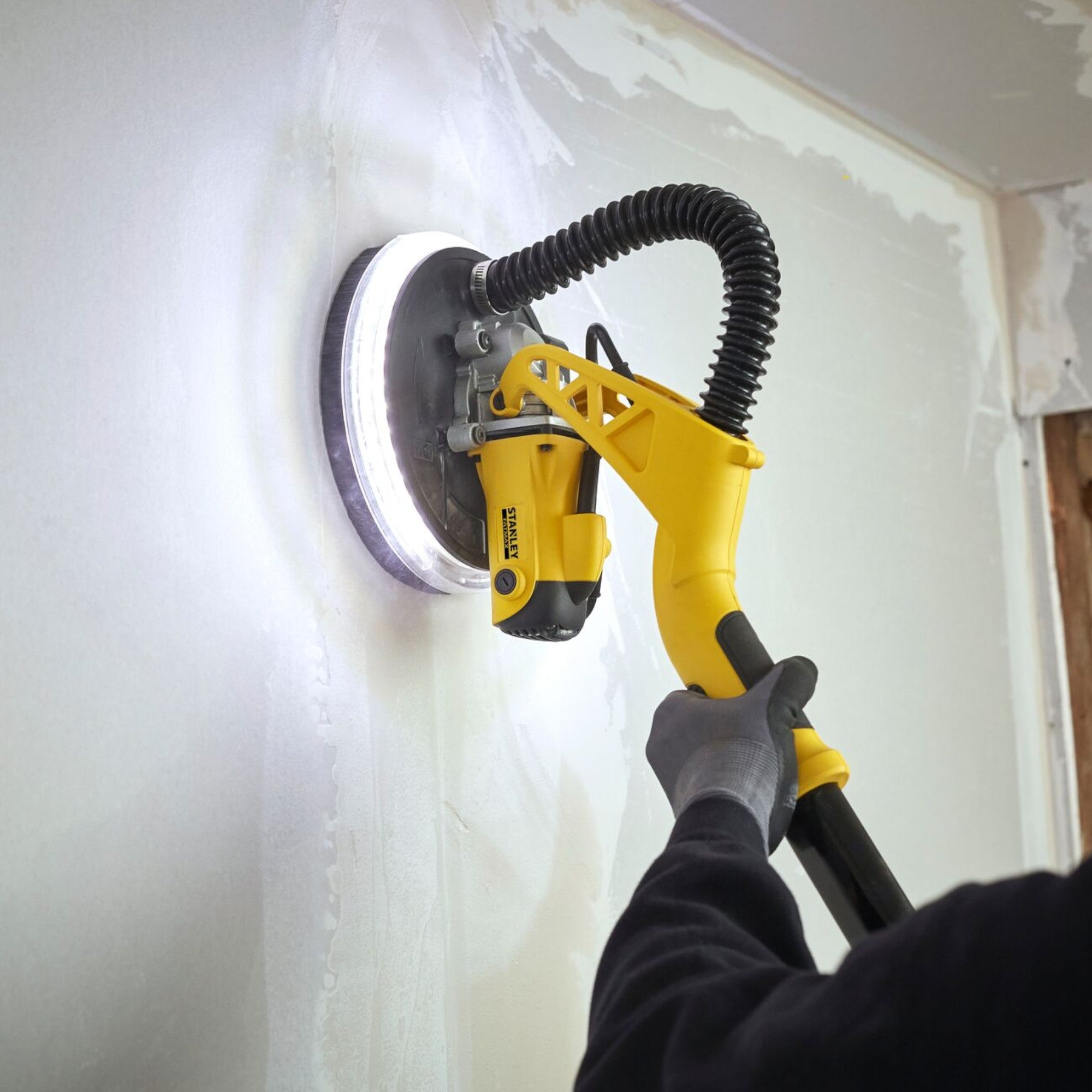 Der Stanley Fatmax SFMEE500S Trockenbauschleifer ist die ideale Lösung für anspruchsvolle Schleifarbeiten an Wänden und Decken. Mit seinem robusten 750-Watt-Motor liefert er eine hohe Schleifeffizienz und ermöglicht ein schnelles und präzises Arbeiten. Das kompakte, ergonomische Design und die leichte Konstruktion sorgen für eine geringe Ermüdung auch bei längeren Einsätzen. Die Drehzahlvorwahl von 600 bis 1.700 U/min mit Soft-Start bietet optimale Anpassung an unterschiedliche Anwendungen, während der LED-Lichtring den Arbeitsbereich ausleuchtet und Fugen, Flecken oder Unebenheiten sichtbar macht. Der Teleskopgriff, der auf bis zu 180 cm ausgezogen werden kann, eignet sich hervorragend für Deckenarbeiten und größere Schleifflächen. Der elastische Absaugschlauch ermöglicht maximale Flexibilität mit einem Schleifwinkel von bis zu 120°, und der abnehmbare Schleifschutz erlaubt das Schleifen bis in die Ecken. Dank des geschwungenen Kopfhalterdesigns und der gummierten Griffflächen bietet der Schleifer eine optimale Balance und hohen Bedienkomfort. Der faltbare Griff und die mitgelieferte Werkzeugtasche erleichtern das Verstauen und den Transport. Der Stanley Fatmax SFMEE500S ist die perfekte Wahl für professionelle Trockenbauarbeiten, bei denen Effizienz, Präzision und Komfort im Fokus stehen.