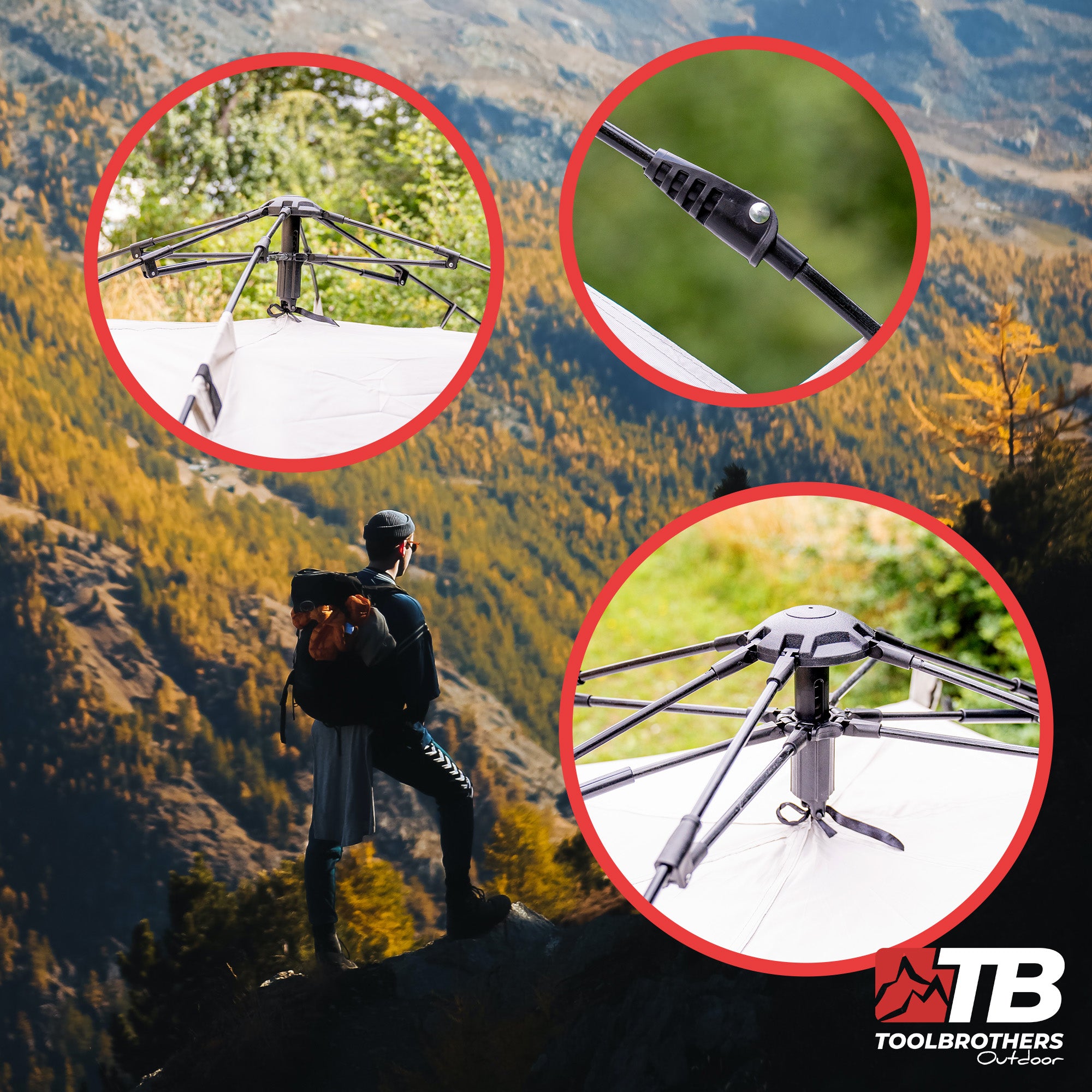 Das Campingzelt von Toolbrothers ist ein hochwertiges Zelt, das speziell für den Outdoor-Einsatz entwickelt wurde. Es bietet Platz für 2-4 Personen und eignet sich perfekt für Campingausflüge oder andere Outdoor-Abenteuer, Zelt besteht aus wasserdichtem 210D Oxford-Stoff, das eine zuverlässige und langanhaltende Wasserdichtigkeit bietet. Dies bedeutet, dass Sie auch bei regnerischem Wetter trocken und geschützt bleiben. Zusätzlich ist die obere Abdeckung mit einer Taudichte versehen, um zusätzlichen Schutz vor Feuchtigkeit zu gewährleisten. das Zelt verfügt über eine 360-Grad-Belüftung, die für eine optimale Luftzirkulation sorgt. Dies ist besonders wichtig, um die Bildung von Kondensation im Zeltinneren zu minimieren und ein angenehmes Raumklima zu schaffen. Die Belüftungsschlitze können geöffnet oder geschlossen werden, je nach den aktuellen Wetterbedingungen und Ihren persönlichen Vorlieben, eine Isoliermatte aus Aluminiumfolie ist im Zelt integriert, um Ihnen zusätzliche Wärmeisolierung zu bieten. Dies ist besonders nützlich bei kälteren Temperaturen oder in höheren Lagen, um die Wärme im Zeltinneren zu halten und für mehr Komfort zu sorgen, außerdem das Zelt ist mit einem Moskitonetz ausgestattet, um lästige Insekten fernzuhalten und Ihnen einen ungestörten Schlaf zu ermöglichen.