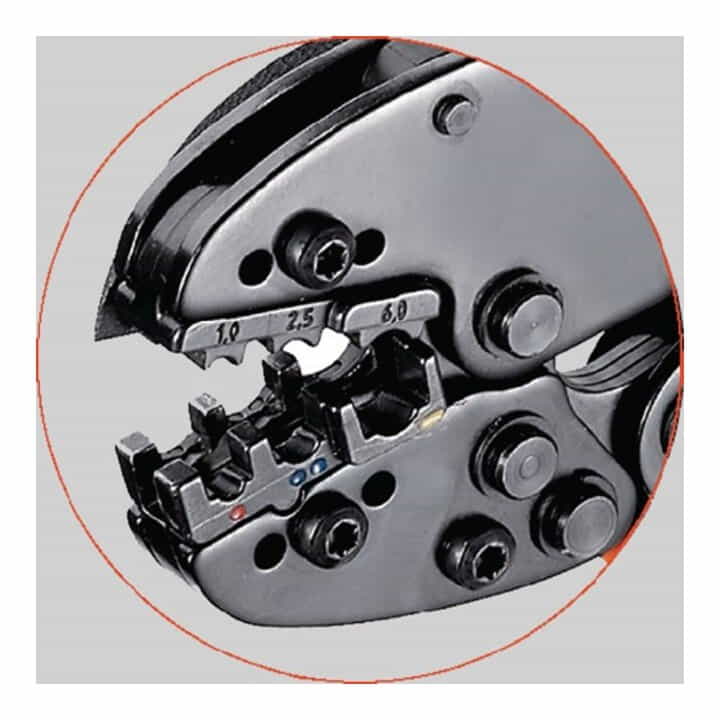 für PVC- und Polyamid-isolierte Verbinder im Querschnittsbereich von 0,5 - 6 mm² (~ AWG 20... 10) · mit Anschlag zur exakten Positionierung der Kontakte · Zwangssperre garantiert Qualitätscrimp · Entriegelungsmöglichkeit bei evtl. Fehlbedienung · für Kabelschuhe, Stiftkabelschuhe, Parallel- und Serienverbinder sowie Steckverbinder · niedrigere Handkräfte durch geschlitzte Pressung