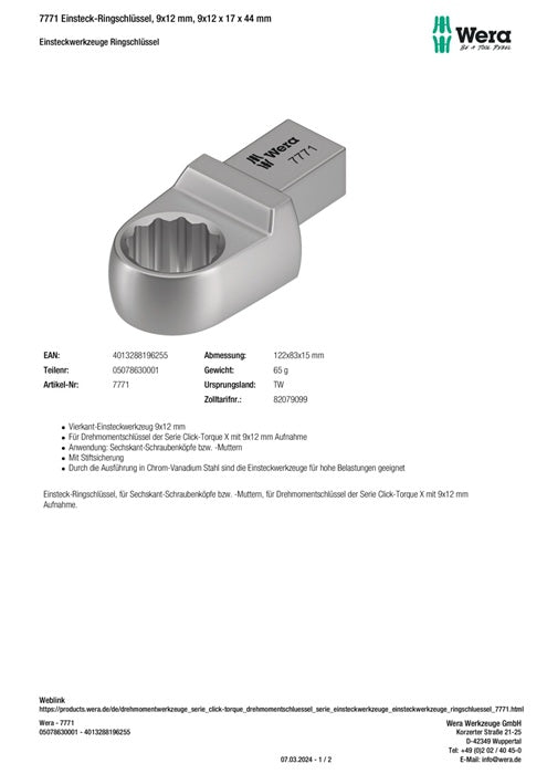 Wera Einsteckringschlüssel 7771 ( 8000377406 ) Schlüsselweite 17 mm 9 x 12 mm