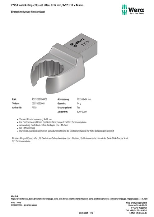 - 1x WERA Einsteckringschlüssel Schlüsselweite 17 mm 9 x 12 mm