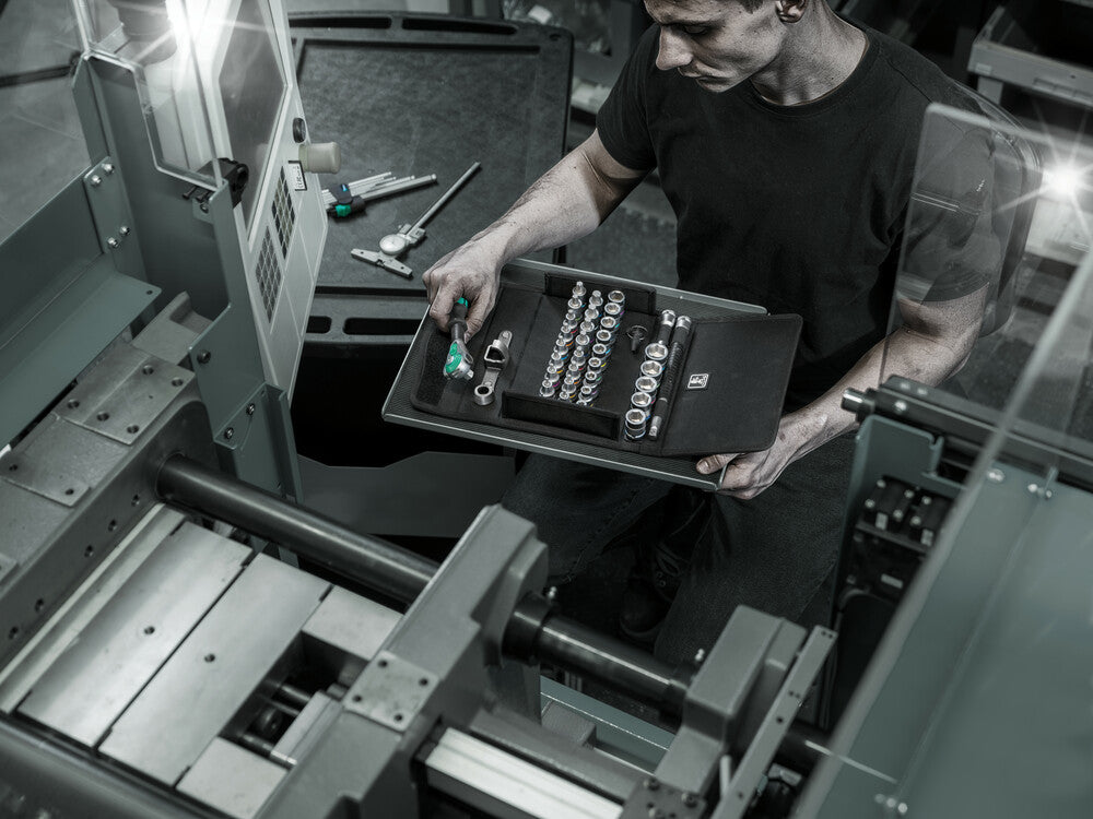 Inhalt: 1 Schwenk- und Umschaltknarre (72 Zähne) mit Schwungmassenkonstruktion und Schnelldrehhülse 1 Wobble-Verlängerung 76 mm mit Ausschwenkwinkel von 15° 1 Verlängerung mit Schnelldrehhülse und Flexible-Lock-System 200 mm je 1 6-kant-Steckschlüsseleinsatz mit Haltefunktion und Farbleitsystem SW 6 / 7 / 8 / 9 / 10 / 11 / 12 / 13 / 14 / 15 / 16 / 17 / 18 / 19 mm* je 1 Steckschlüssel-Einsatz mit Haltefunktion und Farbleitsystem für Schrauben mit Innen-TORX®-Profil Gr. T 10** / 15** / 20 ** / 25** / 27** / 30** / 40** / 45*** / 50*** je 1 Steckschlüssel-Einsatz mit Haltefunktion und Farbleitsystem für Schrauben für Schrauben mit Innensechskant-Profil Gr. 3** / 4** / 5** / 6** / 7*** / 8*** / 9*** / 10*** mm 1 Mutterentnahme-Werkzeug 1 Klettstreifen 50 x 240 mm * Länge 29 mm, ** Länge 35 mm, *** Länge 38,5 mm Lieferung in kompakter Box mit textilem Außenmaterial