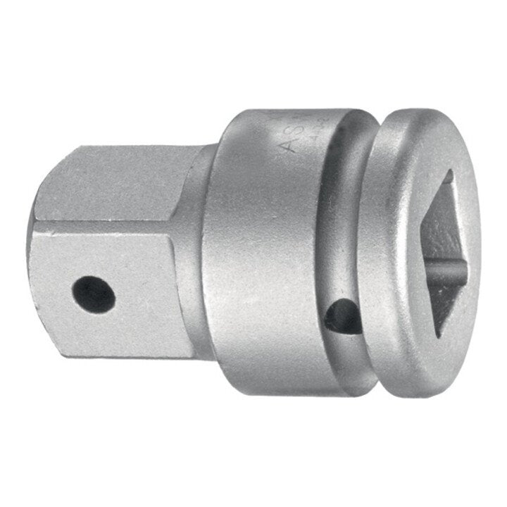 Antrieb: 25,4 mm (1 ″)-Vierkant DIN 3121 · Form H 25 · mit Stiftbohrung und Ringnut Abtrieb: 20 mm (3/4 ″)-Vierkant DIN 3121 mit Durchgangsbohrung · aus Sonderstahl · Oberfläche stahlgrau · geölt · für härteste Beanspruchung auf Elektro- und/oder Druckluft-Schlagschraubern