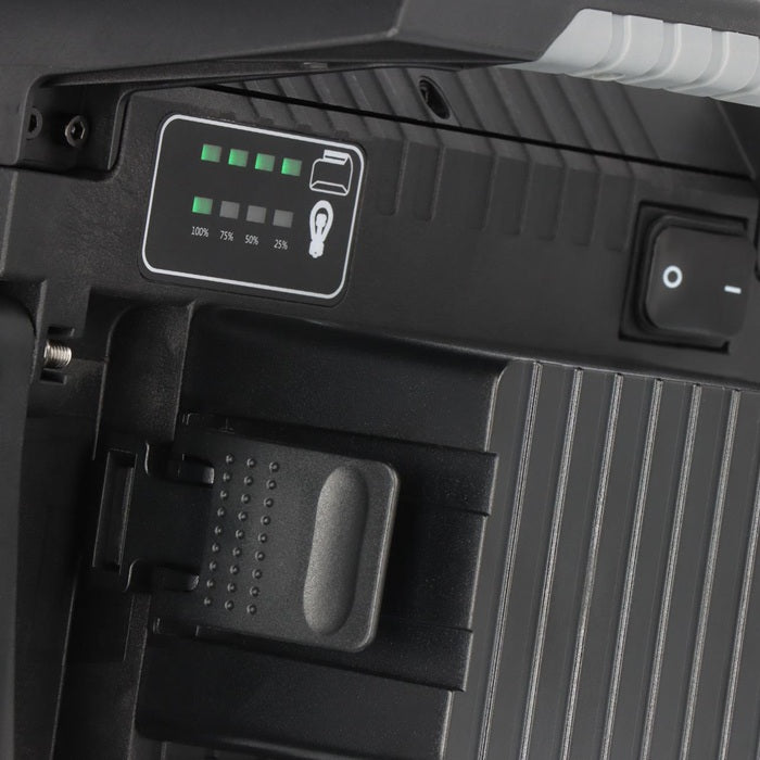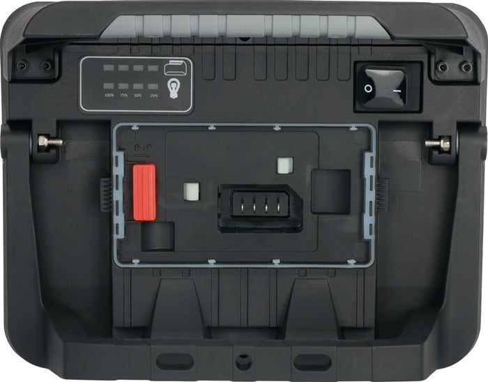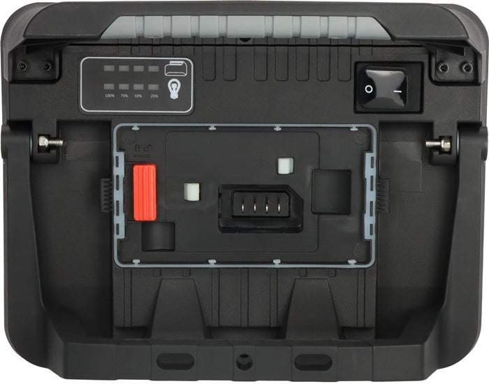 kompatibel mit verschiedenen 18V Akkus (verschiedene Ah Klassen) der Powertool-Hersteller Bosch Professional, Makita, Dewalt, Milwaukee, Metabo CAS, Festool, Flex · Schalter mit Funktion: 100% - 75% - 50% - 25% Licht · Leuchtdauer in Abhängigkeit des verwendeten Akkus, ca. 38 min/1 Ah bei 100 % Lichtleistung · Akku-Zustandsanzeige · Akkus sind vor Tiefenentladung und Überhitzung geschützt · LED Strahler mit Kippschutz, schützt Linse und Gehäuse des Strahlers · standfestes Gehäuse · flachliegend für eine großflächige Ausleuchtung · ergonomischer Griff · Ein/Aus Schalter · Mit leuchtstarken SMD LEDs · Stativmontage möglich