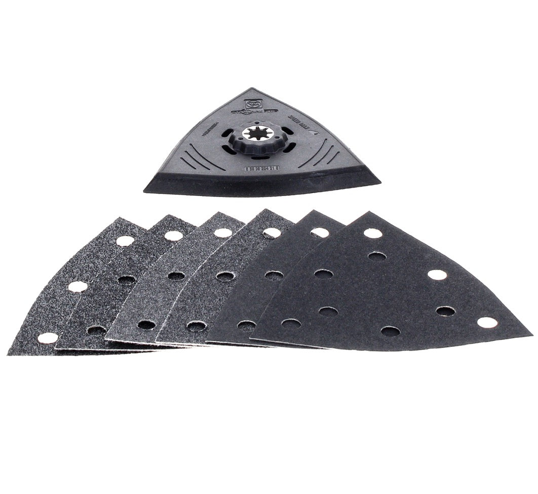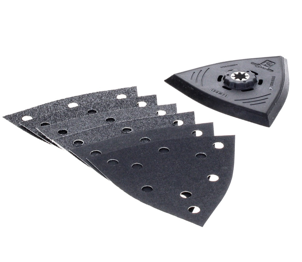- 1x Gelochte Dreiecks-Schleifplatte (Kantenlänge 130 mm)