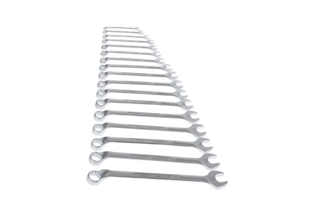 CV-Stahl · verchromt · mit gleichen Schlüsselweiten · Ringseite gekröpft und 10° abgewinkelt, Maulstellung 15° DIN 3113 Form B / ISO 3318 / ISO 7738