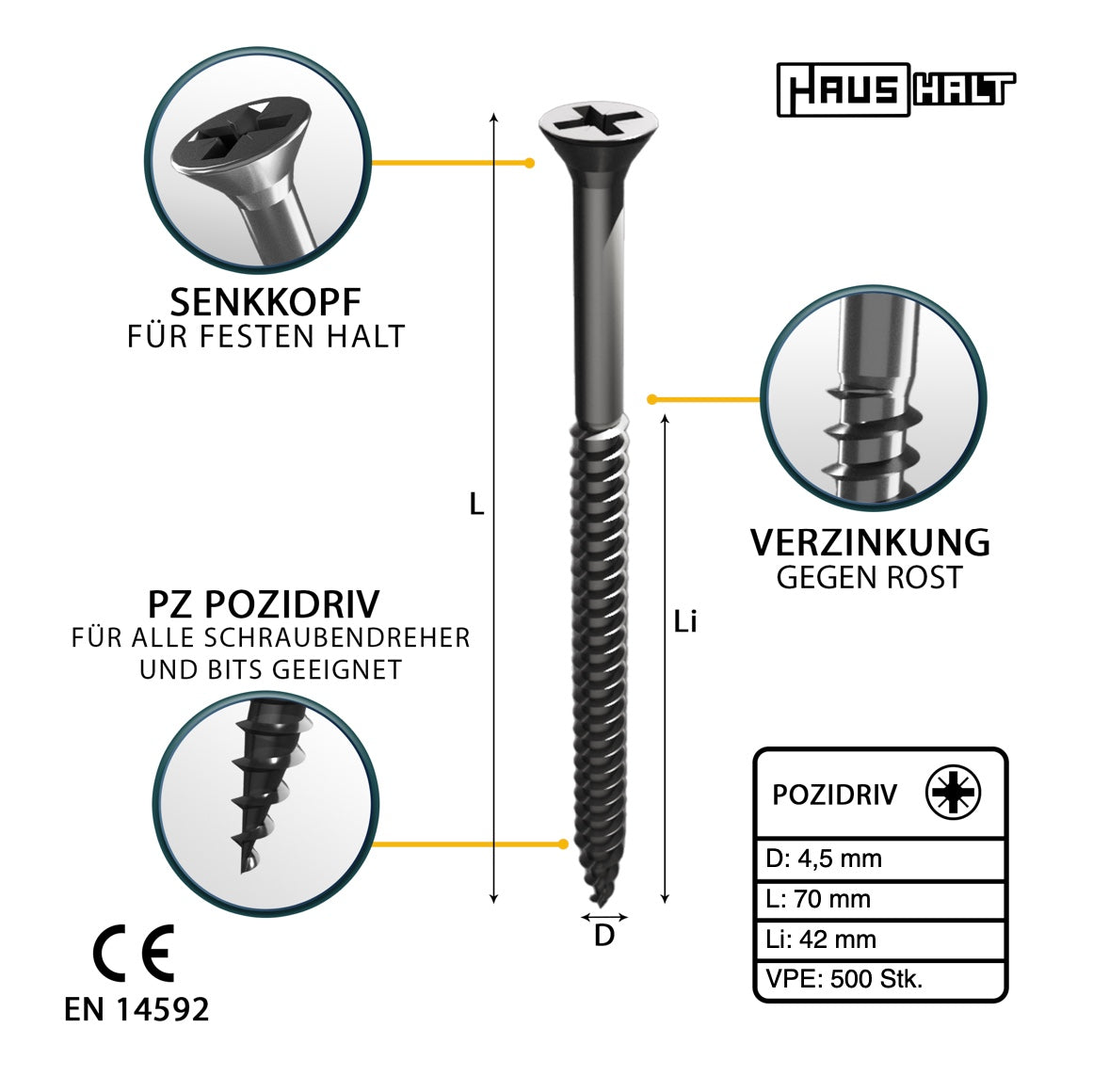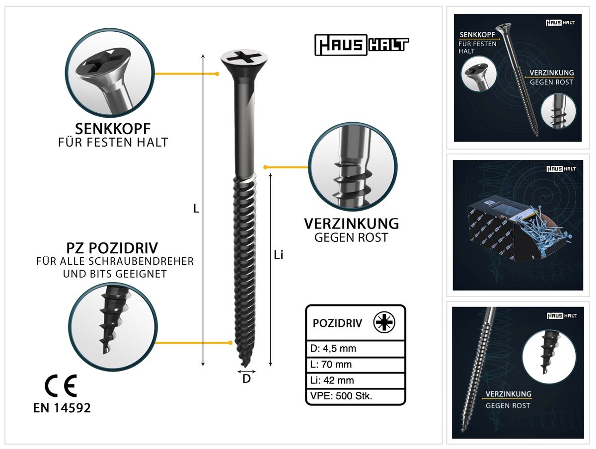 HausHalt Universal Holzbauschraube Holzschraube 4,5 x 70 mm PZ2 500 Stk. ( 2x 000051371177 ) silber verzinkt Kreuzschlitz Pozidriv Senkkopf Teilgewinde