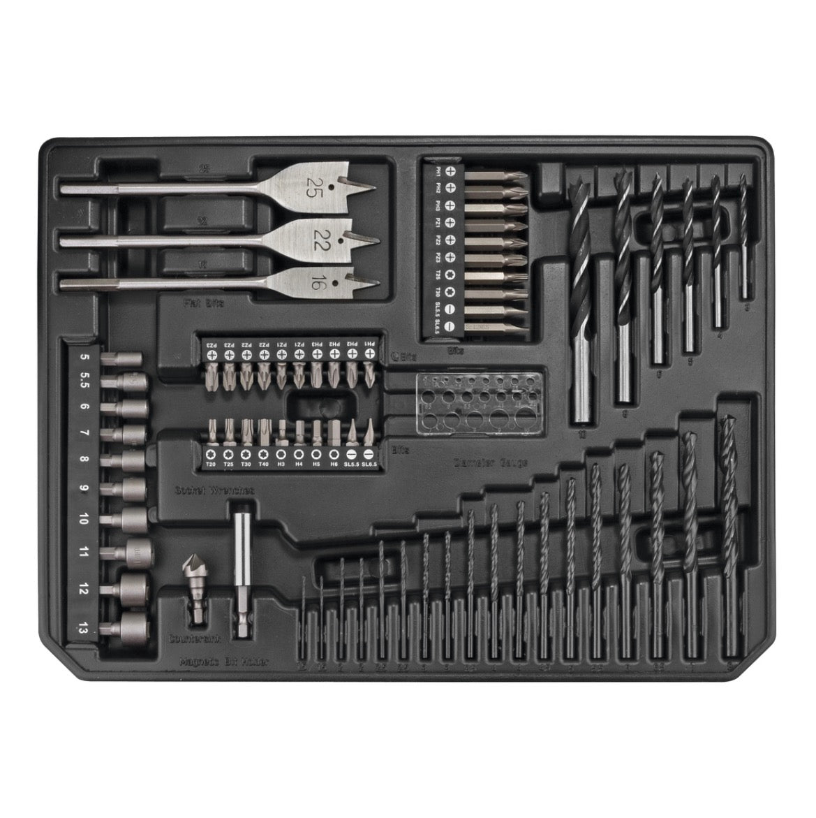 - 20x Bit 25 mm ( PH1 / 2x PH2 / PH3 / 2x PZ1 / 2x PZ2 / 2x PZ3 / T20 / T25 / T30 / T40 / H3 / H4 / H5 / H6 / SL5,5 / SL6,5 )