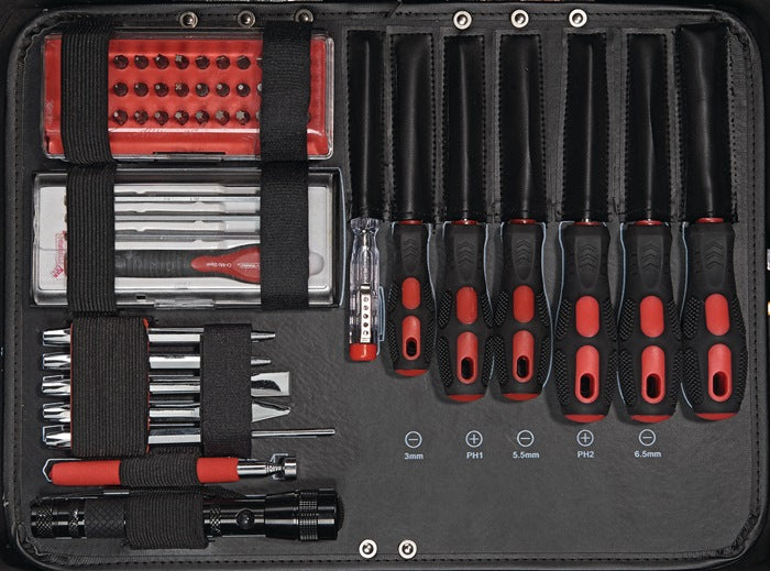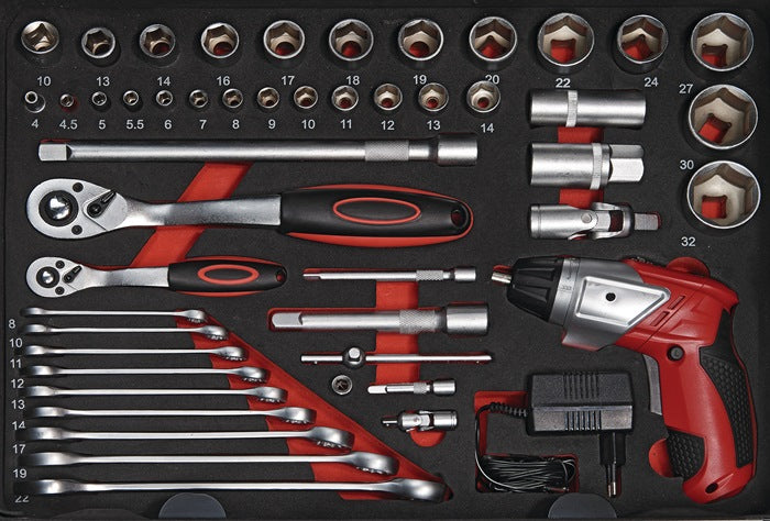 • Inhalt: allgemeine Handwerkzeuge 1 St. Kantenzange 250 mm 1 St. Wasserpumpenzange 250 mm 1 St. Kombizange 180 mm, mit 2-Komponenten-Griffe 1 St. Telefonzange 160 mm, mit 2-Komponenten-Griffe 1 St. Seitenschneider 160 mm, mit 2-Komponenten-Griffe 1 St. Universal-Messer 1 St. Universal-Schere, mit 2-Komponenten-Griffe 1 St. Sicherungsringzange, mit 4 auswechselbaren Aufsätzen 1 St. Metallsägebogen mit Blatt (300 mm) je 1 Winkelschraubendreher mit Kugelkopf, 1,5 / 2 / 2,5 / 3 / 4 / 5 / 6 / 8 / 10 mm (im Kunststoffhalter) 1 St. Rollgabelschlüssel 250 mm je 1 St. Gabel-Ringschlüssel SW 8 / 10 / 11 / 12 / 13 / 14 / 17 / 19 / 22 mm 1 St. Schlosserhammer 300 g 1 St. Taschenlampe 140 mm 1 St. Magnetheber Länge 135 - 600 mm 5 tlg. Meißel-Set (Flach- und Spitzmeißel, Körner, Durchschläger, Splintentreiber im Kunststoffhalter) 4 tlg. Schraubendrehersatz mit Wechselklingen, 120 mm, bestehend aus 2-K-Handgriff und 3 Doppelklingen: 1,5 mm x PH 00 / 2,5 mm x PH 0 / 3,0 mm x PH 1 31 tlg. Bits-Box Inhalt: 7 St. Bits für Schlitzschrauben (3 / 4 / 5 / 5,5 / 6 / 7 / 8 mm) 6 St. Bits für Schrauben mit Kreuzschlitz (PH), (Gr. 1 / 2 / 2 / 3 / 3 / 4) 7 St. Bits für Schrauben mit Kreuzschlitz (PZD), (Gr. 1 / 1 / 2 / 2 / 3 / 3 / 4) 5 St. Sechskantbits für Schrauben mit Innensechskant-Profil (3 / 4 / 5 / 6 / 7 mm) 14 St. Bits für Schrauben mit Innen-TORX®-Profil (T 10 / 10 / 15 / 15 / 15 / 20 / 20 / 25 / 25 / 25 / 30 / 30 / 40 / 40) (alle Bits 25 mm lang) 1 St. magnetischer Bithalter 50 mm, mit Schnellwechselfutter 1 St. Spannungsprüfer 145 mm, 120 - 250 Volt AC je 1 St.Schraubendreher für Schlitzschrauben mit 2-K-Griff 3,0 x 0,5 x 75 / 5,5 x 1,0 x 75 / 6,5 x 1,2 x 100 mm je 1 St. Schraubendreher für Schrauben mit Kreuzschlitz mit 2-K-Griff PH 1 x 75 / PH 2 x 100 mm 1 St Bit-Handhalter 6,3 mm (1/4″) mit 2-K-Griff, Magnet und Schnellwechselfutter je 1 St. Ring-Maulschlüssel 8 / 10 / 11 / 12 / 13 / 14 / 17 / 19 / 22 mm 1 St. Schieblehre, Messbereich 0 - 150 mm 1 St. Rollbandmaß 5 m Inhalt: mit 1/4-Vierkantantrieb 1 St. Umschaltknarre 6,3 mm (1/4″) 72 Zähne, fein-verzahnt, 2-Komponenten-Heft je 1 St. 6-kant-Steckschlüssel-Einsatz 6,3 mm (1/4″)-Vierkantantrieb mit schraubenschonendem Profil und Rändelung, 4 / 4,5 / 5 / 5,5 / 6 / 7 / 8 / 9 / 10 / 11 / 12 / 13 / 14 mm 1 St. Griff mit Gleitstück Länge 110 mm 1 St. Kardangelenk 6,3 mm (1/4″) je 1 Verlängerung 6,3 mm (1/4″), 50 / 100 mm lang Inhalt: mit 1/2-Vierkantantrieb 1 St. Umschaltknarre 12,5 mm (1/2″) 72 Zähne, fein-verzahnt, 2-Komponenten-Heft je 1 St. Steckschlüssel-Einsatz 12,5 mm (1/2″)-Vierkantantrieb, mit schraubenschonendem Profil und Rändelung 10 / 13 / 14 / 16 / 17 / 18 / 19 / 20 / 22 / 24 / 27 / 30 / 32 mm je 1 St. Steckschlüsseleinsatz für Zündkerzen, 16 / 21 mm je 1 St. Verlängerung 12,5 mm (1/2″), 125 / 250 mm 1 St. Kardangelenk 12,5 mm (1/2″), 75 mm 1 St. Gleitstück 12,5 mm (1/2″) 1 St. Adapter 6,3 mm (1/4″) Außenvierkant auf 6,3 mm (1/4″) Außensechskant, 30 mm lang 1 St. Adapter 6,3 mm (1/4″) Innenvierkant auf 6,3 mm (1/4″) Innensechskant, 25 mm lang 1 Akkuschrauber mit Lithium Akku 3,6 Volt/1300 mAh, direkte Bitaufnahme 6,3 mm (1/4″) (max. Drehmoment 3 Nm) und integierte LED Leuchte 1 St. Steckerladegerät