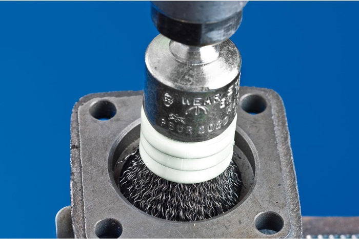 - Vorteile: Sehr gute Korrosionsbeständigkeit. Ist der Besatz bis zum Stützring abgearbeitet kann dieser zur weiteren Nutzung entfernt werden, ohne dass sich das Bürstverhalten ändert. Durch den Kunststoffüberzug wird das Risiko der Kontaktkorrosion vermieden. Optimales Erreichen von schwer zugänglichen Stellen wie Vertiefungen und Bohrungen. Spreizung und Flexibilität des Bürstenbesatzes durch Stützring exakt regulierbar. Durch den Stützring wird ein seitliches Ausweichen der Drähte vermieden. Die Bürste ist entfettet und hinterlässt keine Ölrückstände auf dem Werkstück. Erzeugt feine Oberflächen.
