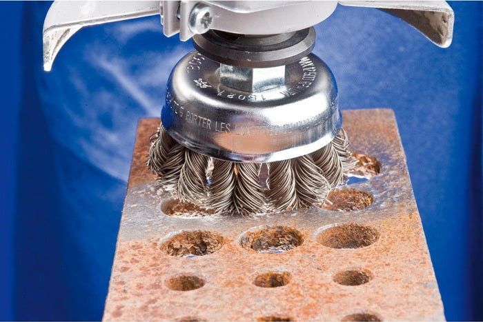 für schwere Bürstarbeiten wie Entgraten, Reinigen, Entrosten und Entzundern sowie zum Entfernen von Schweißspritzern · Besatzmaterial verfügt über eine hohe Zug- und Biegewechselfestigkeit · gewährleistet eine optimale Abnutzung des Drahtes sowie eine hohe Standzeit, auch bei extremen Bürstanwendungen Stahldraht hält Temperaturen bis 300 °C stand · M14