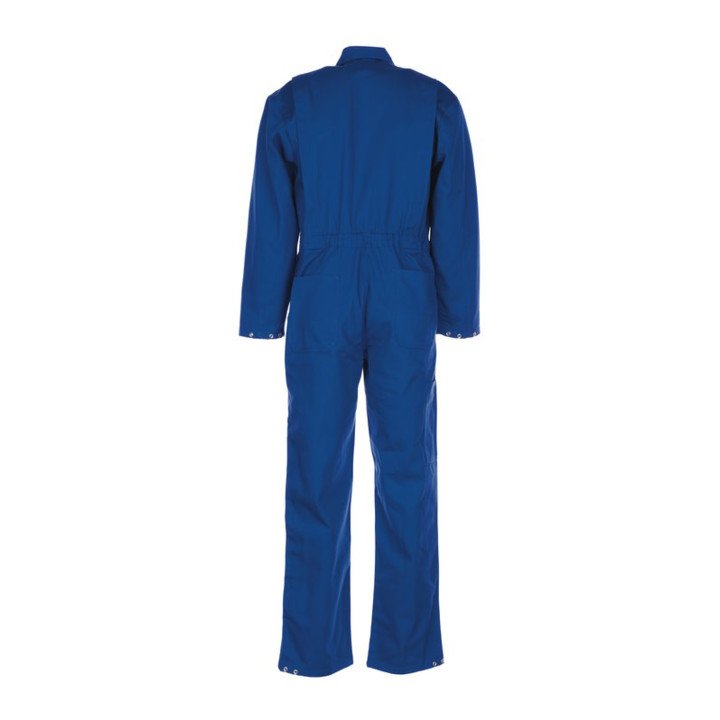100% Baumwolle, ca. 290 g/m² · Baumwolle – optimal getunt · Umlegekragen · 2-Wege-Reißverschluss ca. 70 cm · 2 Brusttaschen · 2 aufgesetzte Seitentaschen · 1 Maßstabtasche · 2 Gesäßtaschen · 2 seitliche Durchgriffe · verstellbarer Gummizug im Rücken · verstellbare Fußweite an den Beinen · verstellbare Ärmelbündchen · DIN 61535 auf Anfrage lieferbare Größen: 42-64, 90-110 und 24-29
