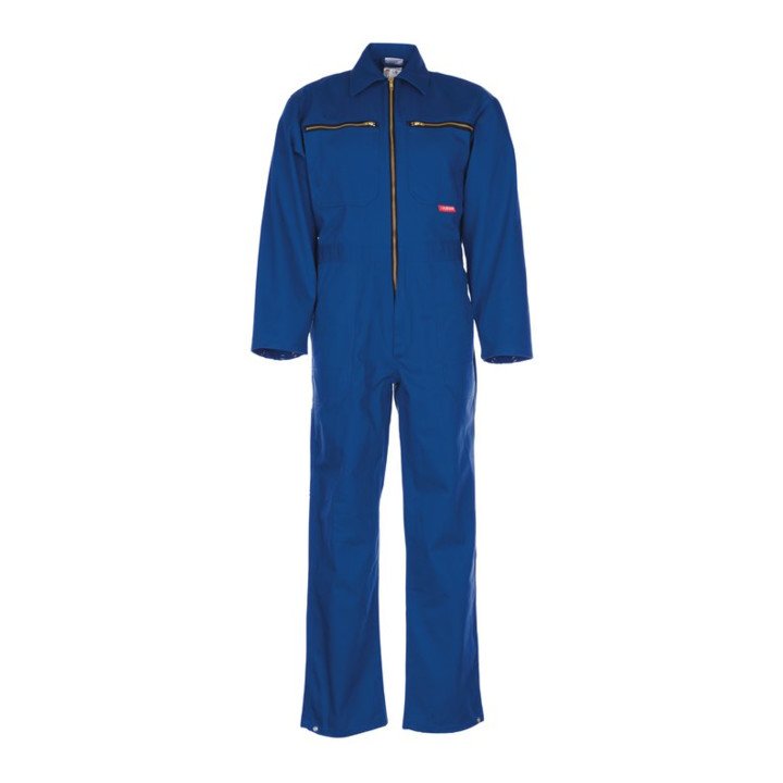 100% Baumwolle, ca. 290 g/m² · Baumwolle – optimal getunt · Umlegekragen · 2-Wege-Reißverschluss ca. 70 cm · 2 Brusttaschen · 2 aufgesetzte Seitentaschen · 1 Maßstabtasche · 2 Gesäßtaschen · 2 seitliche Durchgriffe · verstellbarer Gummizug im Rücken · verstellbare Fußweite an den Beinen · verstellbare Ärmelbündchen · DIN 61535 auf Anfrage lieferbare Größen: 42-64, 90-110 und 24-29