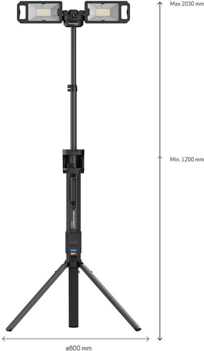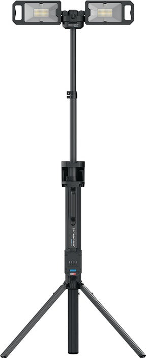 Baustrahler mit 5000 Lumen und integriertem Stativ für 18-V-Akkupacks · zwei eingebaute Flutlichtstrahler · um 360° drehbar · SCHNELLFALTSYSTEM · Gewicht 5,2 kg Lieferung ohne Akku/Connector