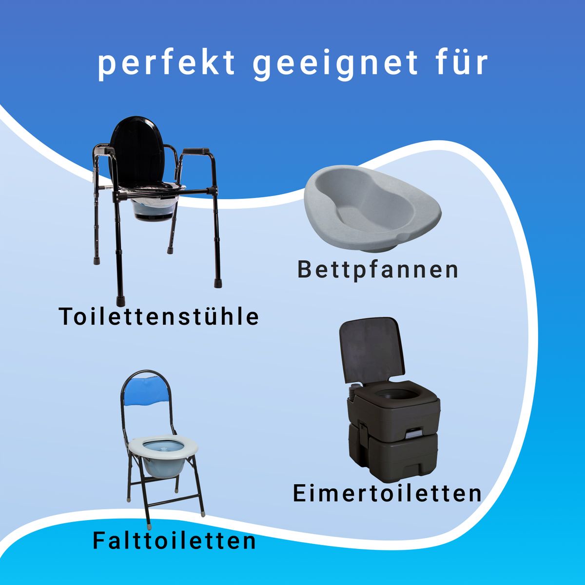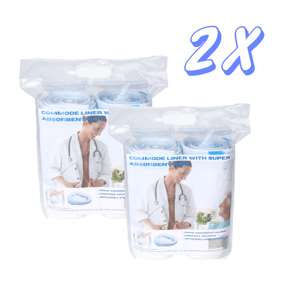 Mit diesen Toiletteneinlagen lassen sich flüssige und feste Abfälle, ohne Rückstände von Verschmutzungen, aus tragbaren Toiletten entfernen. Die Anwendung gestaltet sich sehr einfach. Dafür wird die Kunststoffeinlage zusammen mit der absorbierenden Unterlage in den Toiletteneimer eingelegt. Nach dem Gebrauch wird die Toiletteneinlage herausgenommen und mit dem integrierten Kordelzug dicht verschlossen. Danach kann die Einlage, wie eine Windel, im Müll entsorgt werden. Während des Gebrauchs sorgt die absorbierende Einlage dafür, dass bis zu 500ml Flüssigkeit eingesaugt und unschöne Spritzer vermieden werden. Die Verwendung der Toiletteneinlage bringt einige Vorteile mit sich, denn sie hält zum einen den Toiletteneimer sauber und spart zum anderen Zeit für das Pflegepersonal. Darüber hinaus werden Gerüche neutralisiert, was dafür sorgt, dass der Raum weiterhin frisch riecht. Die Einlage wurde für Personen entwickelt, welche Bettlägerig oder grundsätzlich in Ihrer Mobilität eingeschränkt sind. Dazu zählen unter anderem Personen, die sich von einer Operation erholen, Schwangere, Senioren mit beginnender Demenz, sowie adipöse Erwachsene. Ausgelegt sind die Toiletteneinlagen für Bettpfannen, tragbare Toiletten und Toilettenstühle mit rundem Eimer. Die gewählten Materialien sind besonders robust und sind für die Entsorgung in der Mülltonne zugelassen. Im Lieferumfang sind insgesamt 40 Toiletteneinlagen und absorbierende Unterlagen enthalten.