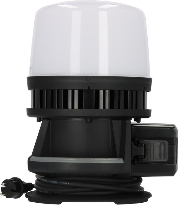 leuchtstarker Multi Battery LED 360° Hybrid Baustrahler · staub- und spritzwassergeschützt · kompatibel zu elf 18V Akku-Systemen der Powertool-Hersteller: Bosch Professional, Dewalt, Einhell, Fein, Festool, Flex, Hikoki, Makita, Metabo CAS, Milwaukee und Würth · Ein/Aus Schalter, über welchen man zudem die 4 Schaltstufen (100% - 75% - 50% - 25% Licht) steuert · Hybrid-Technik: Netz und Akku Betrieb möglich · mit fest installiertem 5 m Kabel (H07RN-F2X1,0) · Akku-Zustandsanzeige · Kabelaufwicklung · Haken zum Aufhängen · flexible Nutzung: stehend, hängend, auf Stativ montierbar · Leuchtdauer in Abhängigkeit des verwendeten Akkus: ca. 12 min/1Ah bei 100% Lichtleistung, ca. 16 min/1Ah bei 75% Lichtleistung, ca. 24 min/1Ah bei 50% Lichtleistung, ca. 48 min/1Ah bei 25% Lichtleistung · Farbtemperatur: 6500K · Schutzart: IP54 · Schlagfestigkeit: IK08