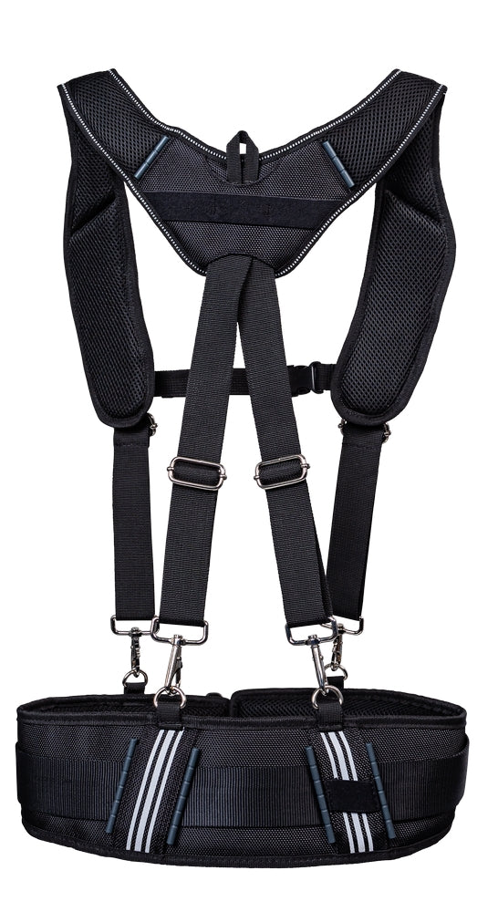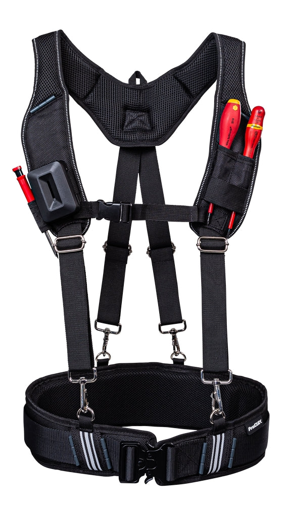 Der ProClick Suspenders S/M ist die ideale Ergänzung für Werkzeuggürtel und bietet ein gepolstertes 4-Punkt Hosenträgersystem. Erhältlich in der Größe S/M, passt er sich dank der stufenlos längenverstellbaren Gurtbänder jeder Körpergröße perfekt an und garantiert somit einen hohen Tragekomfort und eine optimale Lastverteilung. Ausgestattet mit praktischen Steckfächern, Stiftschlaufen und einer Bandschlaufe zur Anbringung des ProClick Holders sorgt dieser Hosenträger für eine effiziente Organisation Ihrer Werkzeuge. Die vier Karabiner gewährleisten zudem eine sichere Verbindung mit dem ProClick Tool Belt. Die Länge der Polsterung beträgt 420 mm.