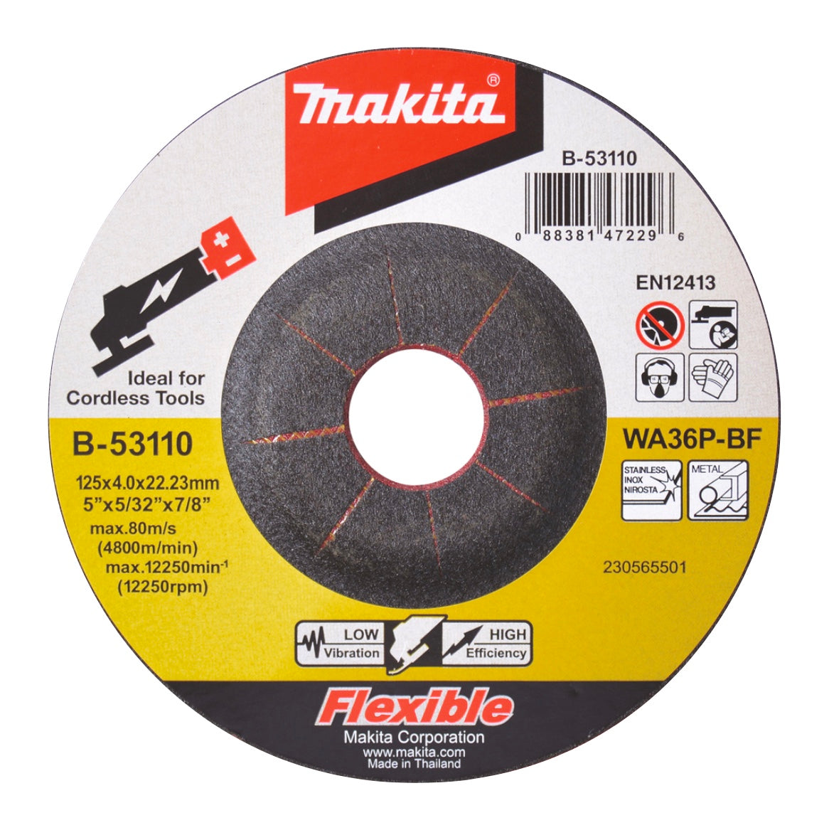 Der Winkelschleifer eignet sich als Schleifer, Drahtbürste und Trennschleifmaschine, es ist aber nicht geeignet zum Sandschleifen und Polieren. Mit seinem 125 mm Durchmesser und sehr flachem Getriebegehäuse ermöglicht das Werkzeug Arbeiten bei eingeengten Platzverhältnissen. Der Winkelschleifer besitzt einen luftgekühlten PM58-Hochleistungsmotor und austauschbare Kohlebürsten. Das verbaute schrägverzahnte Getriebe sorgt für vibrationsarmen Einsatz und maximale Lebensdauer der Maschine. Der integrierte Verriegelungsschalter sorgt für einen sicheren Einsatz des Schleifers, zugleich garantiert der zweifach positionierbare Seitengriff perfekte Maschinenkontrolle bei allen Anwendungen. Die Schnellwechselmutter ermöglicht problemlosen und sicheren Scheibenwechsel in kürzester Zeit zusätzlich zur mitgelieferten Schutzhaube, die werkzeuglos, schnell und unkompliziert je nach Bedarf des Anwenders verstellt werden kann. Die Makita B-53110 Schruppscheiben sind ausgelegt für jeden 125 mm Winkelschleifer und geeignet zur Bearbeitung von Metallen und Edelstahl. Die Scheiben sind vibrationsgedämpft, was dem Handling beim Arbeiten zu Gute kommt. Durch die besonderen Materialeigenschaften lassen sich pro Akkuladung bis zu 70% mehr Material abtragen als mit herkömmlichen Schruppscheiben. Für weitere Sicherheit sind die Scheiben besonders bruchfest hergestellt und rostfrei.