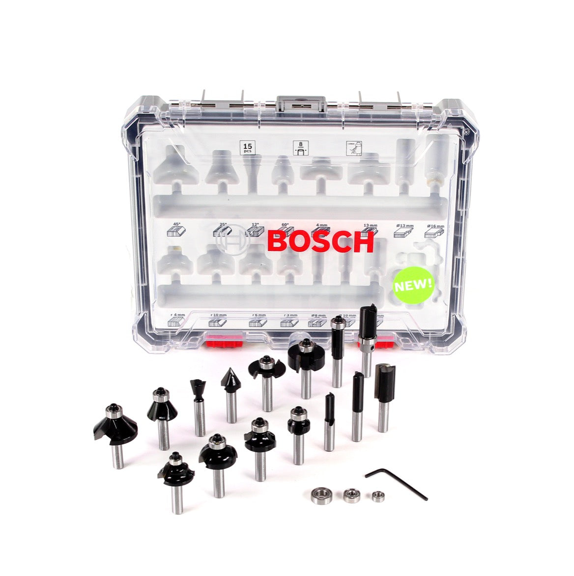 Das Bosch Mixed Fräser Set eignet sich für die Feinbearbeitung und ermöglicht diverse Anwendungen bei der Holzbearbeitung. Dank verschiedener Geometrien lassen sich mit dem Set eine Vielzahl von Profilen fräsen. Die Fräser eignen sich für die Bearbeitung von Weich- und Hartholz und Holzverbundstoffen. Die Hartmetallschneiden garantieren eine überdurchschnittlich lange Lebensdauer und präzise Arbeit. Zusammen mit der Kombifräse wird das Bosch Mixed Fräser Set im Kunststoffkoffer angeboten, das sich für die Feinbearbeitung und ermöglicht diverse Anwendungen bei der Holzbearbeitung eignet. Dank verschiedener Geometrien lassen sich mit dem Set eine Vielzahl von Profilen fräsen. Die Fräser eignen sich für die Bearbeitung von Weich- und Hartholz und Holzverbundstoffen. Die Hartmetallschneiden garantieren eine überdurchschnittlich lange Lebensdauer und präzise Arbeit. Das Set bestehet aus den folgenden Teilen: 1x Bosch Bündigfräser, 1x Bosch Bündig-Profilfräser, 1x Bosch Zinkenfräser, 2x Bosch Fasefräser, 1x Bosch V-Nutfräser, 1x Bosch Scheibenfräser, 1x Bosch Falzfräser, 1x Bosch Römerprofilfräser, 1x Bosch Kehlfräser, 2x Bosch Abrundfräser, 2x Bosch 2-schneidiger Nutfräser, 1x Bosch 3-schneidiger Nutfräser, 3x Kugellager, 1x Imbusschlüsse.