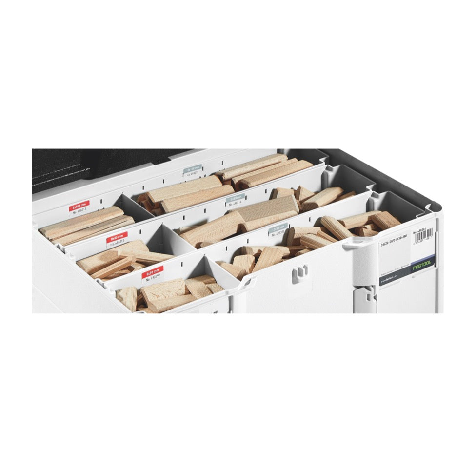 Das Festool Domino Dübel Sortiment besteht aus 306 Domino Dübeln in verschiedenen Größen. Die Dübel sind aus massivem Hartholz gefertigt, wodurch stabile und kraftschlüssige Verbindungen ermöglicht werden. Die Domino Dübel vereinen die Vorteile von runden und flachen Dübeln, durch die quellenden Leimtaschen und seitlichen Längsrippen wird eine optimale Passgenauigkeit erreicht. Die Verbindungen sind absolut verdrehsicher ab dem ersten Dübel. Die mitgelieferten Domino XL Fräser für die Größen 8 und 10 ermöglichen exakte Dübelfräsungen für die Domino Dübel. Festool ist ein Premiumhersteller von Elektrowerkzeugen, eine lange Tradition und eine hochwertige Verarbeitung zeichnen das Unternehmen aus.