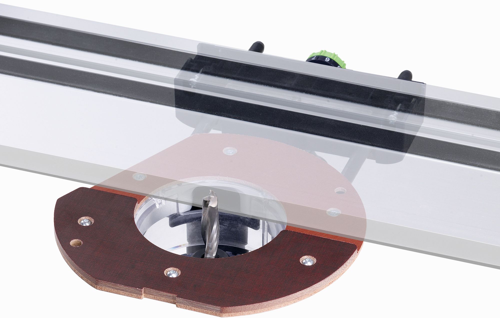 Mit dem Führungsschienen-Adapter kann die Oberfräse sicher und exakt gerade auf der Führungsschiene geführt werden. Die Kombination mit der Führungsschiene eignet sich vor allem zum Einfräsen von Nuten, Gratleisten, Ziernuten oder Ausfräsungen in der Fläche.