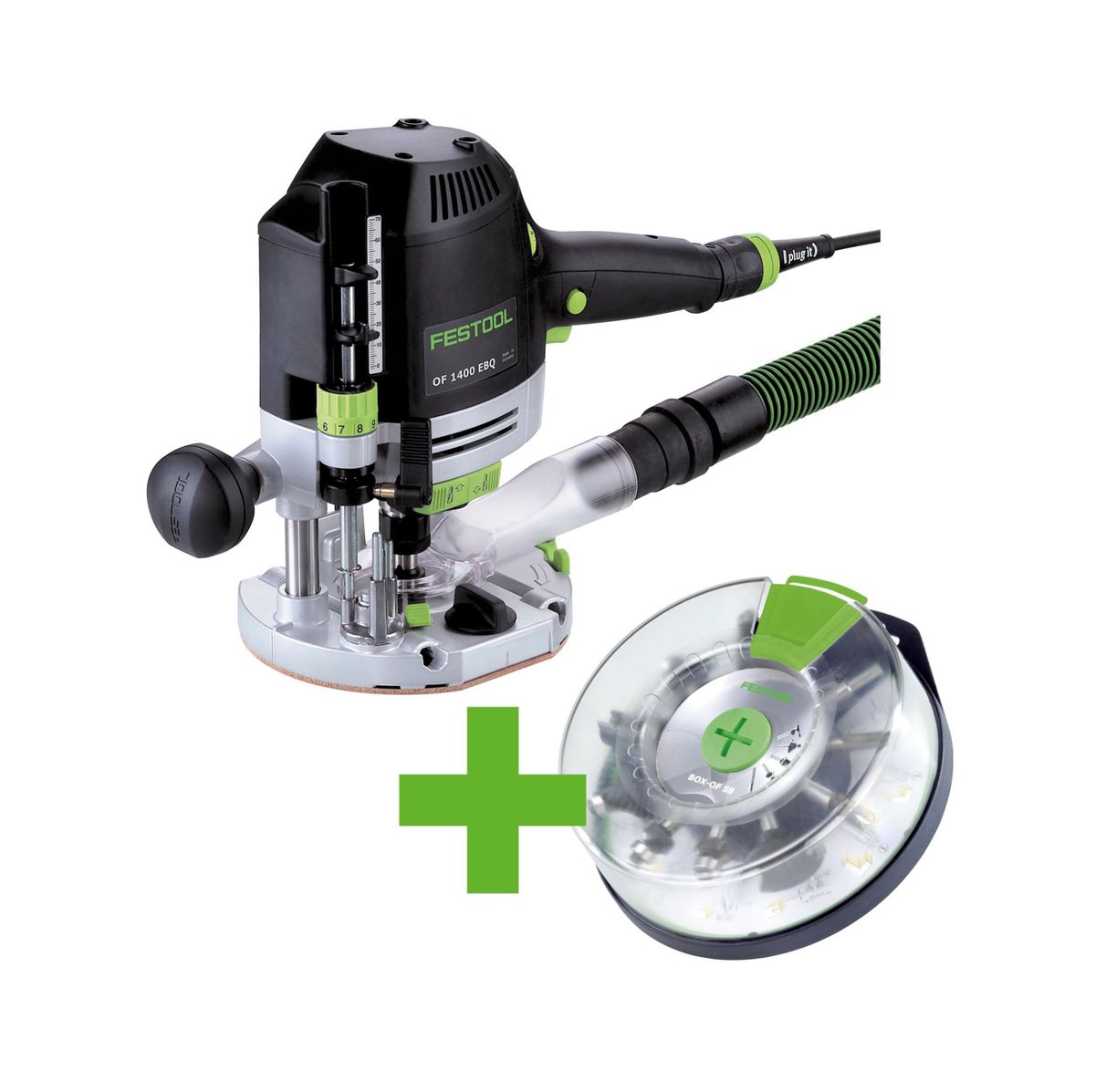 Festool OF 1400 EBQ-PLUS Oberfräse 1400W 70mm Hub ( 574398 ) + Zubehör + Box-OF-S 8/10x HW Fräser Box 10 tlg. + Systainer