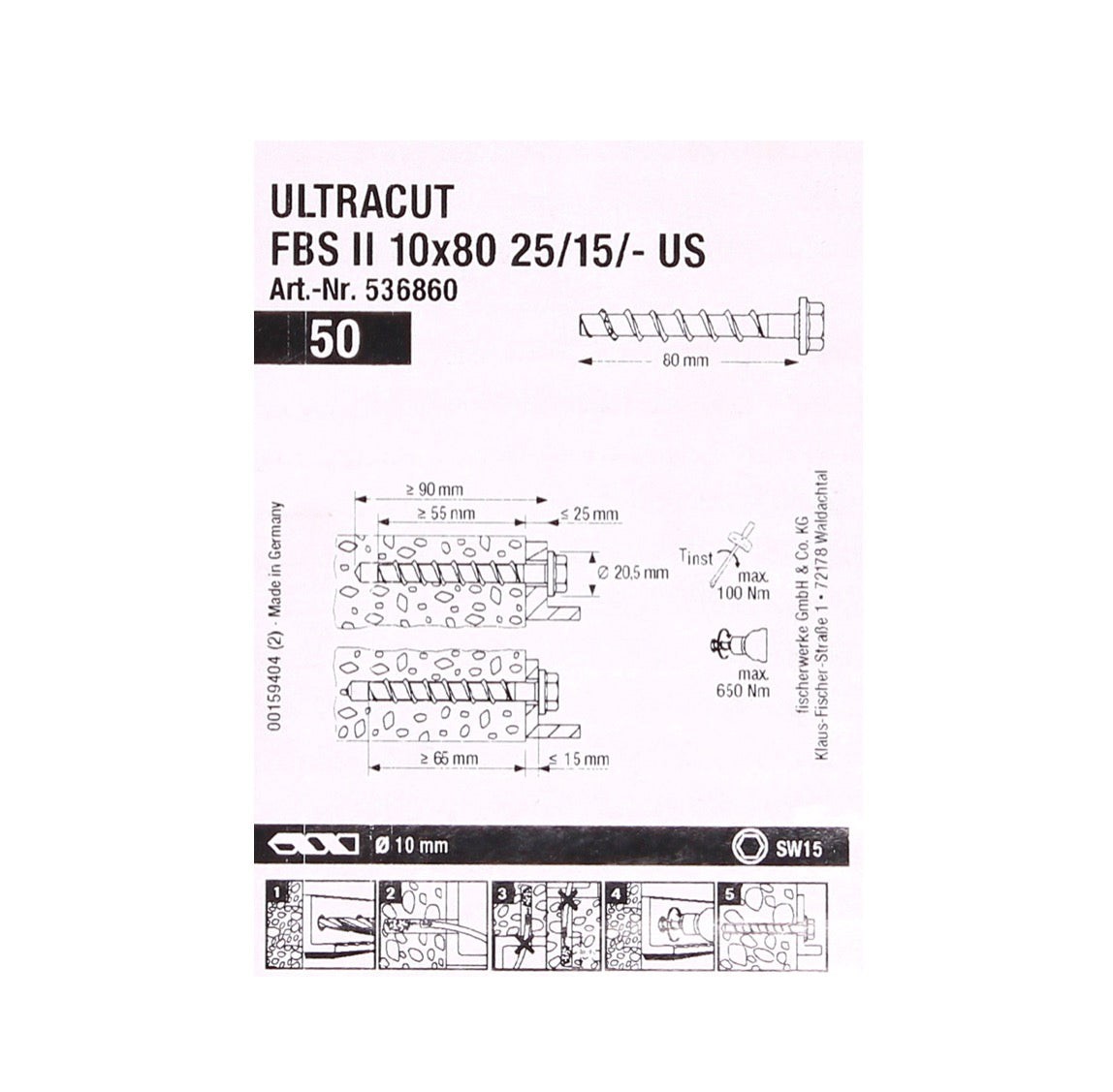 Fischer ULTRACUT FBS II Betonschrauben 10x80mm 25/15/- 200 Stk. Sechskantkopf SW15 ( 553687 ) + Makita NEMESIS 2 SDS-Plus 10x215mm ( B-58213 )