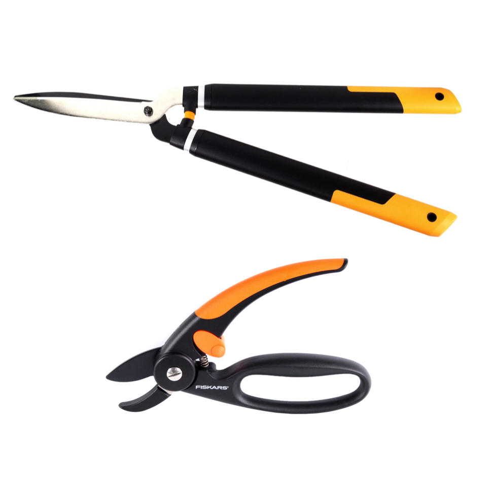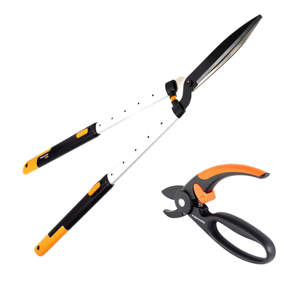 Fiskars Set 1x Teleskop Heckenschere HS86 68 cm auf 93 cm + 1x P43 Amboss Gartenschere Fingerloop