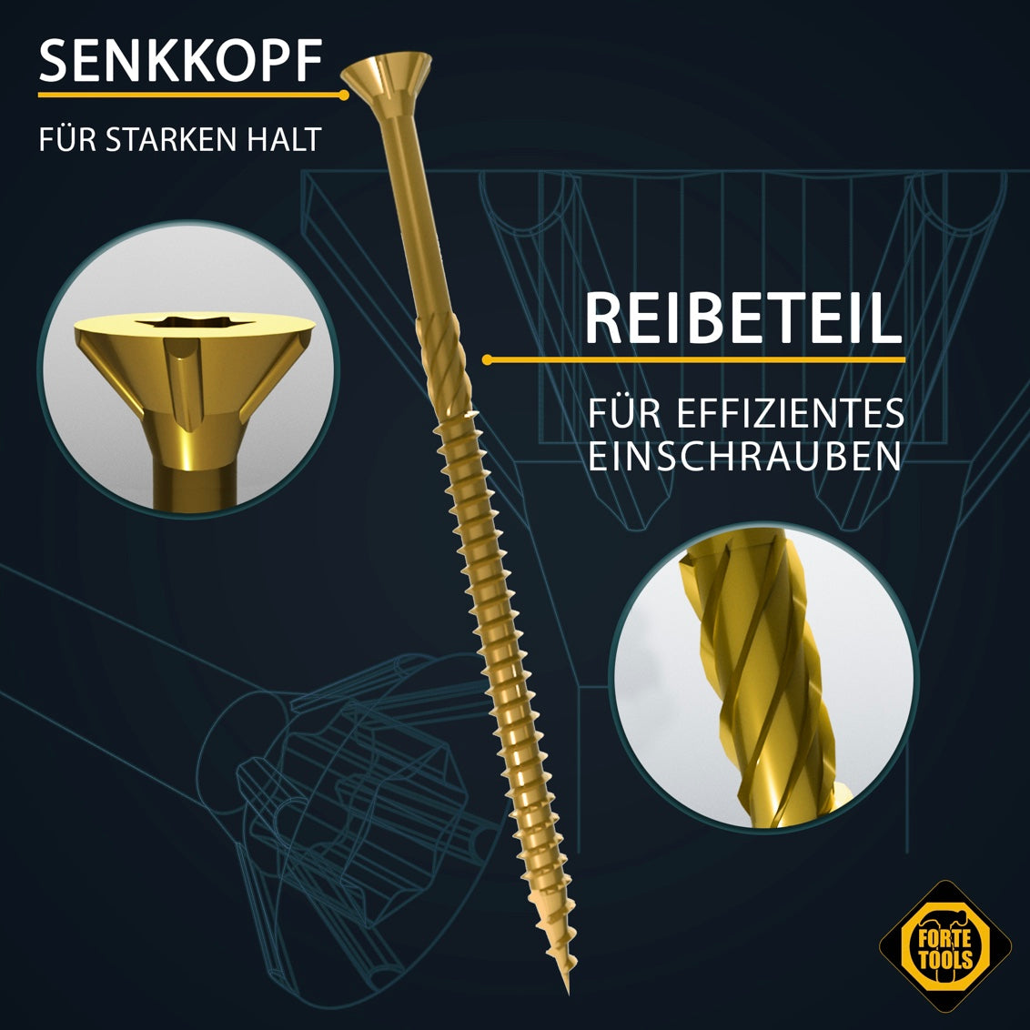 Die FORTE Tools Holzschraube mit Torx Aufnahme garantiert dem Anwender eine hohe Flexibilität durch universelle Einsetzbarkeit in Holz. Der Senkkopf sorgt für eine saubere und bündige Versenkung der Schraube in Holz. Die Torx Aufnahme erlaubt eine bessere Kraftübertragung auf die Schraube, höhere Standzeiten sowie ein schnelleres Einfädeln der Schraube mit zugleich besserem Passsitz am Werkstück. Der Reibeteil ermöglicht ein effizienteres einschrauben. Zusätzlich sorgt das Wellenprofil am vorderen Gewinde für ein leichtes und sicheres Verschrauben. Die Verzinkung sorgt für einen Korrosionsschutz und eine deutlich höhere Oberflächenhärte als herkömmliche blanke Schrauben, wodurch sich die Einsatzmöglichkeiten um ein vielfaches im Außenbereich erweitern lassen.