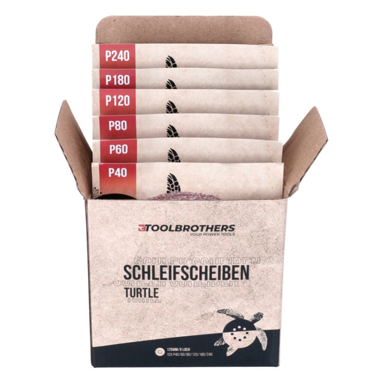 Der Güde EXS 125 E ist ein handlicher Exzenterschleifer für den professionellen Einsatz. Er verfügt über ein integriertes Staubabsaugsystem um den Arbeitsplatz möglichst sauber zu halten. Mit einem integrierten, arretierbaren Schalter, lässt sich das Gerät in den Dauerbetrieb schalten. Die ergonomischen Anti-Rutsch-Handgriffe mit Softgrip Auflage sorgen für ein sicheres und angenehmes Arbeiten. Der Schleifteller mit Klettverschluss ermöglicht ein schnelles und einfach wechseln der Schleifpapiere. Güde ist ein führender Hersteller für Elektrowerkzeuge, eine lange Tradition und hohe Qualitätstandarts zeichnen das Unternehmen aus. Die Firma Toolbrothers hat sich bereits als Vergleichsportal für Werkzeuge einen Namen gemacht und bringt nun mit ihrem TURTLE Schleifset eine breite Auswahl der gängigsten benötigten Schleifmittel auf den Markt. Egal ob Hart- oder Weichholz, Furnier, Stein, Lacke, Aluminium, Stahl, oder das entfernen von Rost auf Stahl, für viele Anwendungsbereiche ist das passende Schleifmittel enthalten und man ist bestens dafür gewappnet. Durch die hochwertige Aluminiumoxid Beschichtung sind die Schleifscheiben äußerst robust und bleiben auch bei längeren Schleifarbeiten standhaft. Durch die gewebeverstärkte Klettrückseite haftet das Schleifpapier besonders fest am Schleifteller des Exzenterschleifers. Mithilfe der 8 Löcher ist eine optimale Staubabsaugung gewährleistet, was das Schleifergebnis positiv beeinflusst und die Langlebigkeit der Schleifscheiben erhöht. Durch die 125 mm Schleifscheiben von der Firma Toolbrothers haben Sie eine kostengünstige aber hochwertige Alternative zu teureren Markenprodukten.