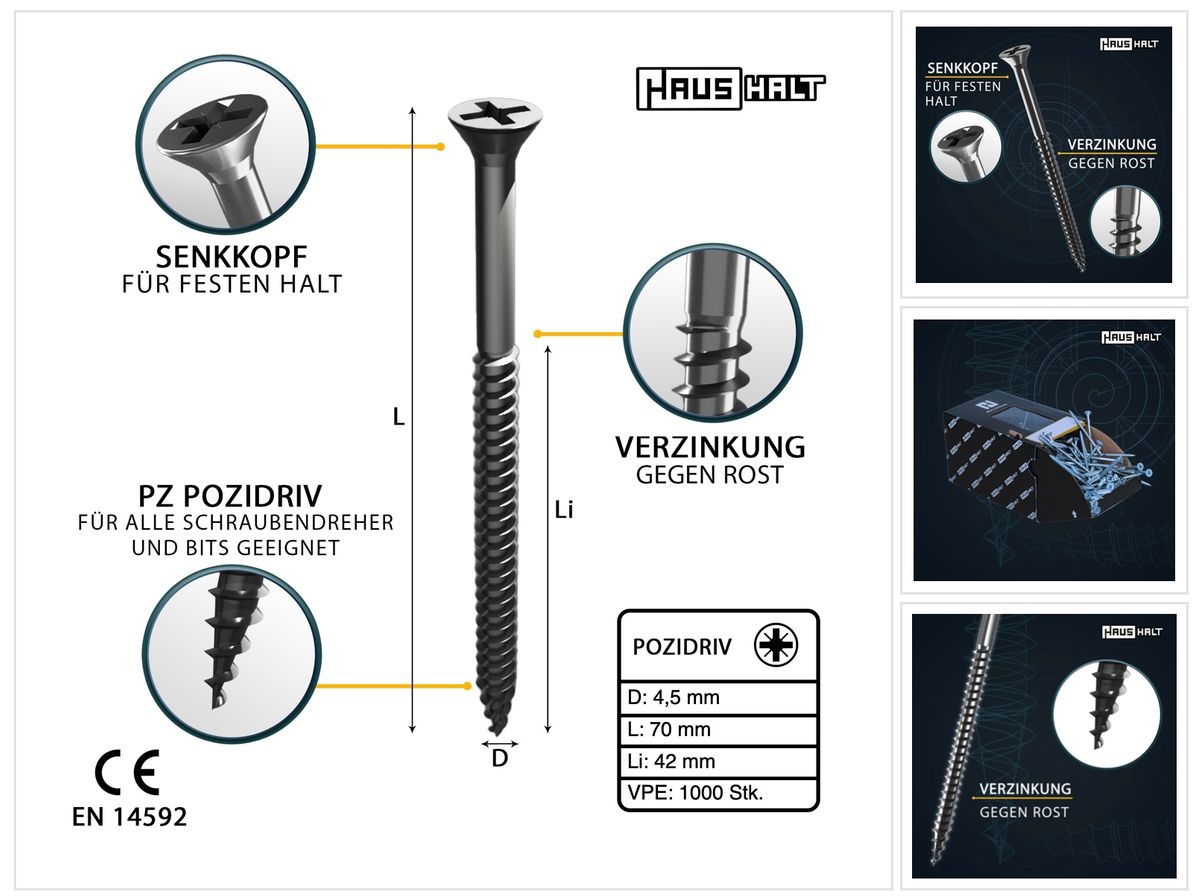 HausHalt Universal Holzbauschraube Holzschraube 4,5 x 70 mm PZ2 1000 Stk. ( 4x 000051371177 ) silber verzinkt Kreuzschlitz Pozidriv Senkkopf Teilgewinde
