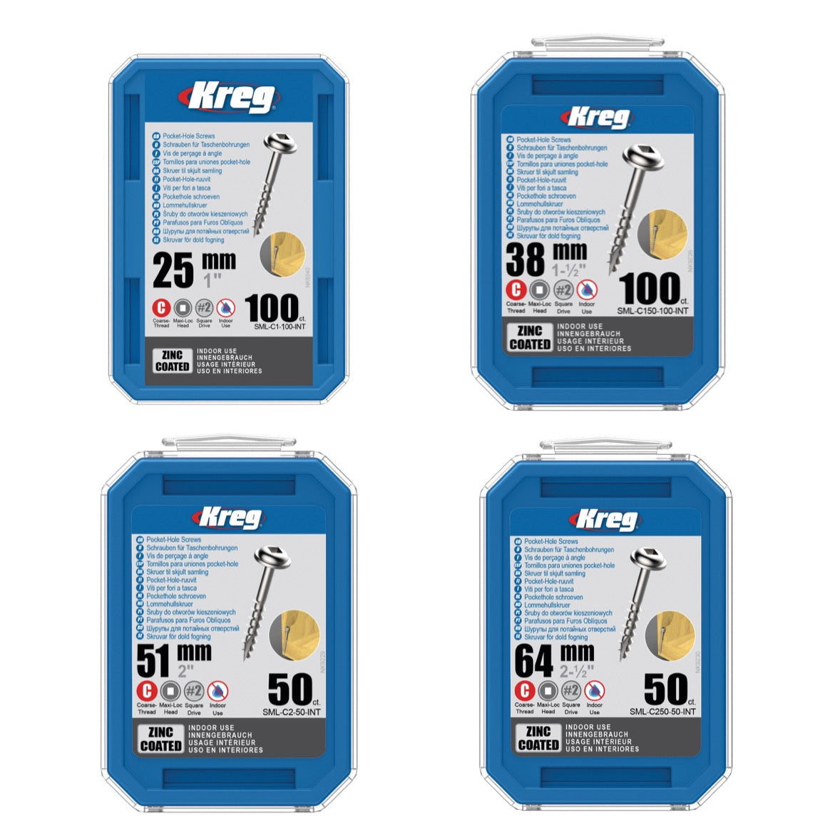 Bei diesen Schrauben von KREG handelt es sich um Linsenkopfschrauben, die für Taschenbohrungen (Pocket Holes) geeignet sind. Sie sind verzinkt, sodass sie gegen Rost geschützt sind. Sie haben Vierkantantrieb und ein Teilgewinde / Grobgewinde und sind selbstschneidend. Pocket Holes sind abgestufte Bohrlöcher, die in einem sehr flachen Winkel zur Holzoberfläche gebohrt werden. Die dort eingedrehte Schraube verschwindet komplett im Holz. Dieses Set beinhaltet Schrauben für den Innengebrauch in den Längen 25, 38, 51 und 64 mm. Mit dem Kreg-Jig-System ist die Herstellung hochwertiger Möbel und Holzarbeiten für jeden Handwerker einfach und bequem zu verwirklichen.