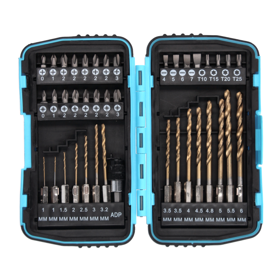 - 14x Bohrer ( 2x 1 / 1x 1,5 / 1x 2 / 1x 2,5 / 1x 3 / 1x 3,2 / 1x 3,5 / 1x 4 / 1x 4,5 / 1x 4,8 / 1x 5 / 1x 5,5 / 1x 6 mm )
